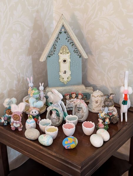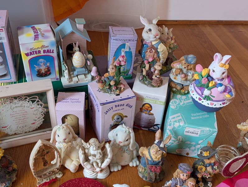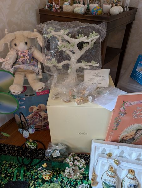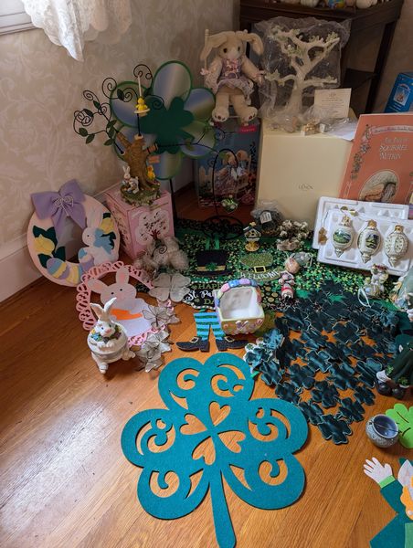 Seasonal Décor, featuring Valentine's, St. Patrick's, Easter. Lenox Luck of the Irish Tree, 1'H; set of three porcelain ornaments (boxed); figurines; books; flags; optional side table, 18"Wx20"Dx26"H.