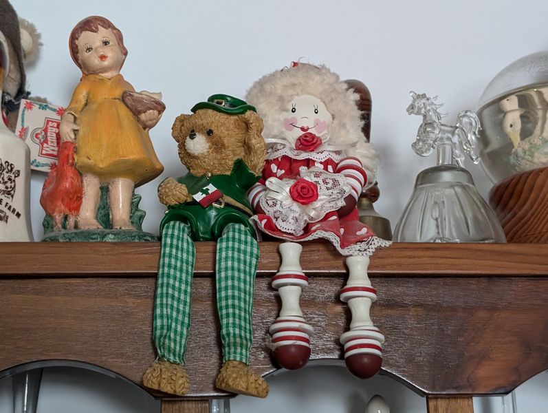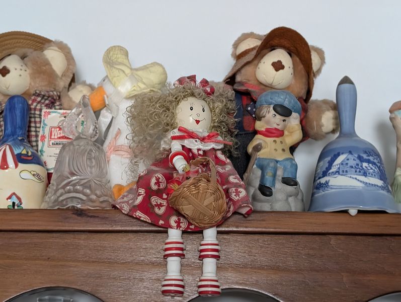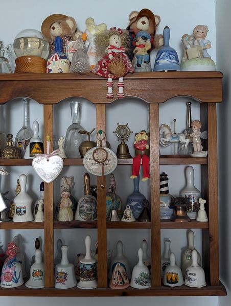 Collectibles, Wall Shelf. Very large bell collection (one of two); vintage & antique collectibles; wall display shelf, 3'Wx5.5"Dx23"H. See photos (items requires cleaning). Loc on 2nd floor,