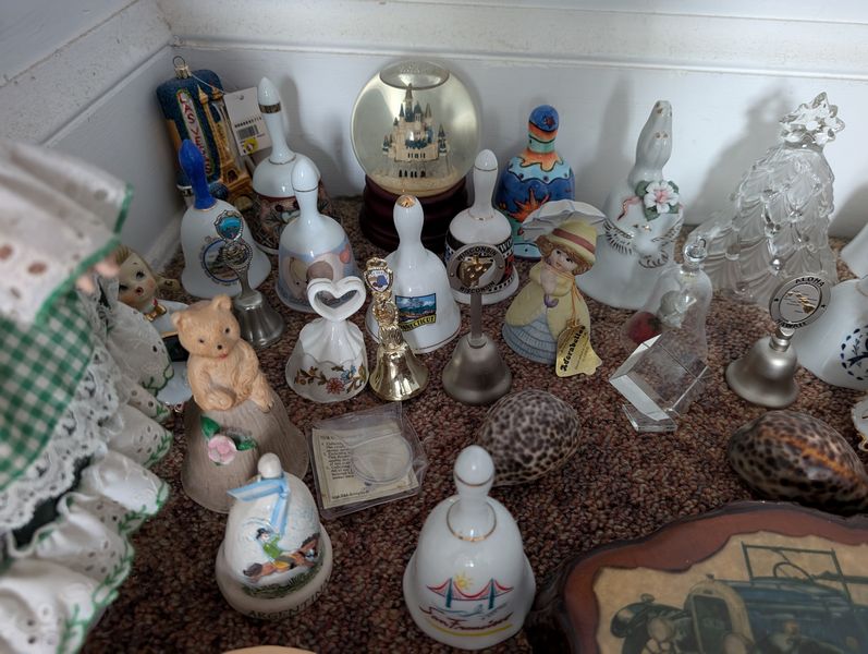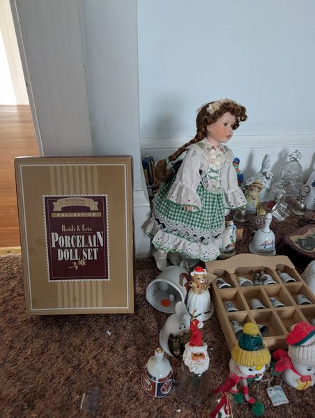 Collectibles, featuring Dolls, Books, Bells. Large bell collection (two of two); porcelain dolls, including two standing and one gift set (boxed); vintage children's books; other related items as seen in photos, handcrafted bisque porcelain Snow Bells (3) and wood clock. Loc on 2nd fl.