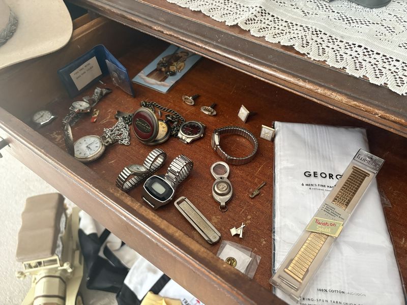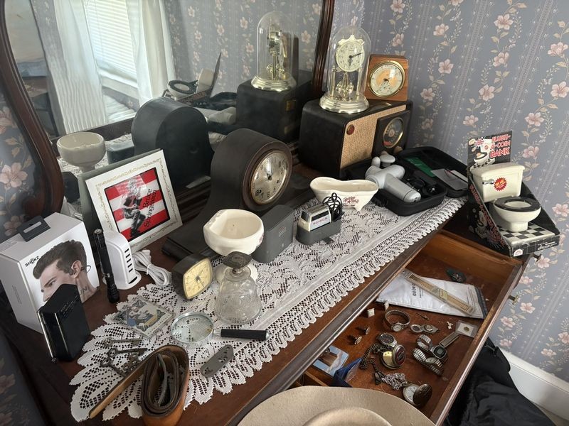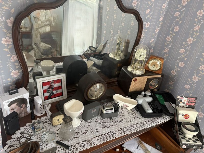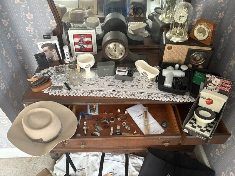 Antique Dresser, Collectibles. Man's antique dresser, 4'Wx21"Dx3'H with dovetailed drawers; attach mirror, 3'Wx31"H; many collectibles, incl: The New Haven Clock Co. mantle clock, 19.5" base x 10"H; other items on dresser. Loc on 2nd fl.