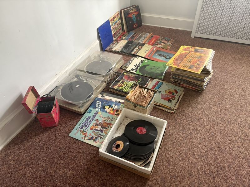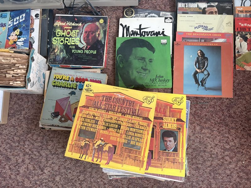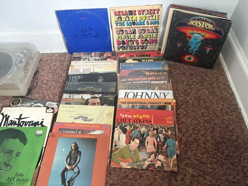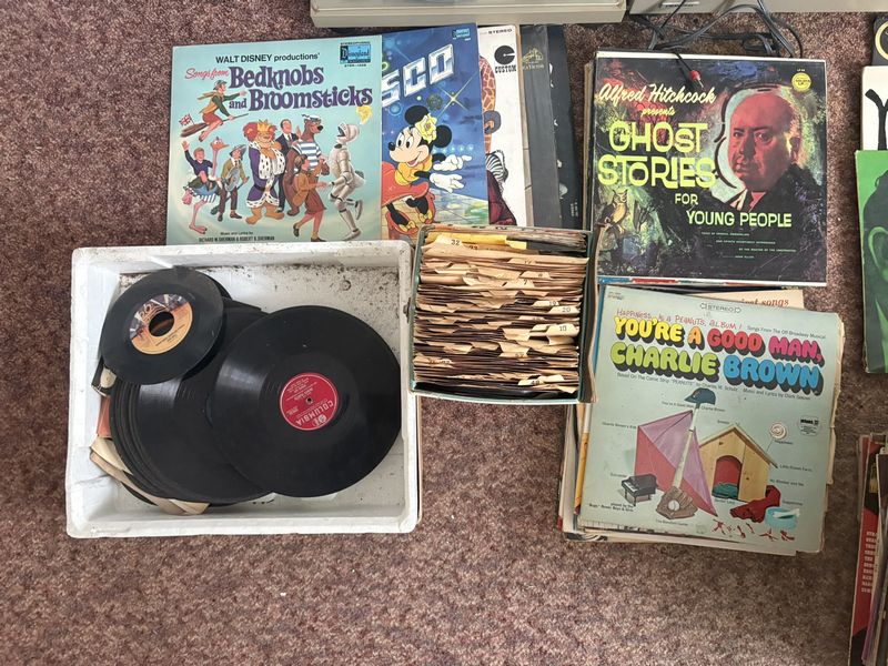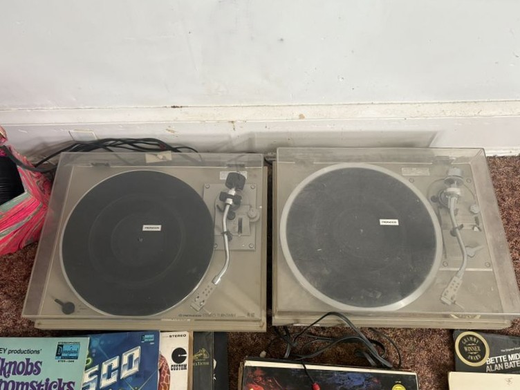 Vintage Electronics. Two turntables; assorted albums (all genres, many classics); 45's (records); other related items. Loc on 2nd fl.