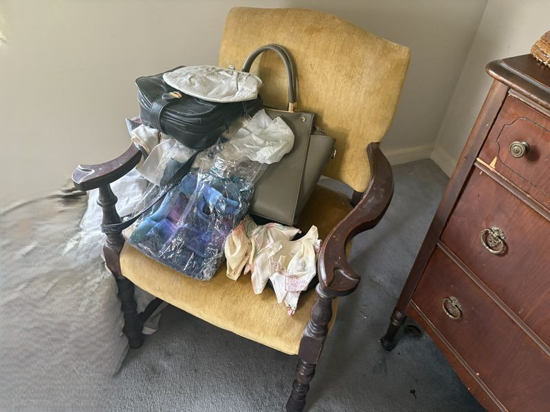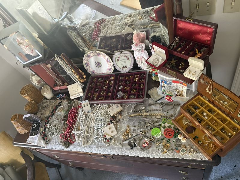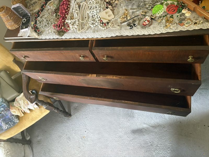 Vintage Furniture and Jewelry. Including dresser, 4'Wx22'Dx3'H with dovetailed drawers; mirror, 37"Wx32"H; boudoir chair, 2'Wx18"Dx32"H; wall art, 33"Wx18"H; large quantity costume jewelry. Loc on 2nd fl.