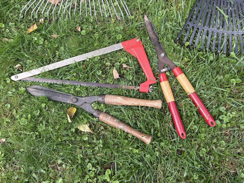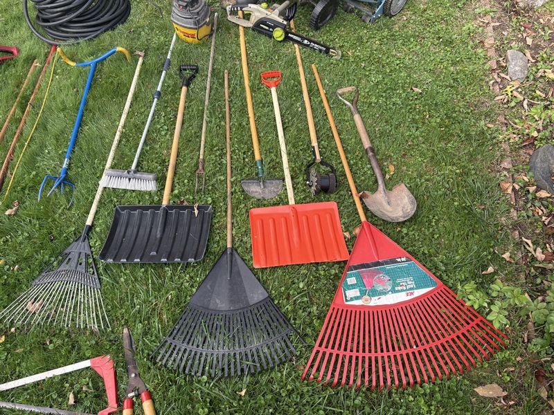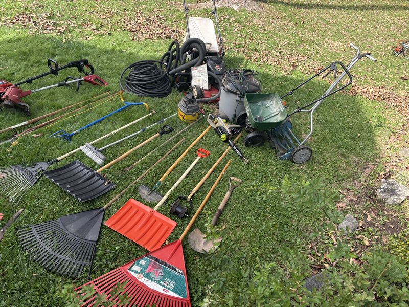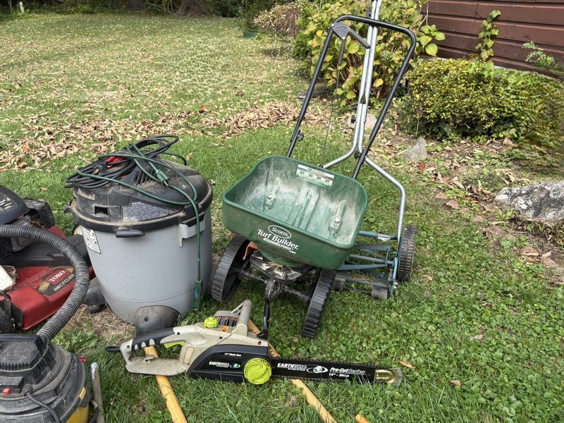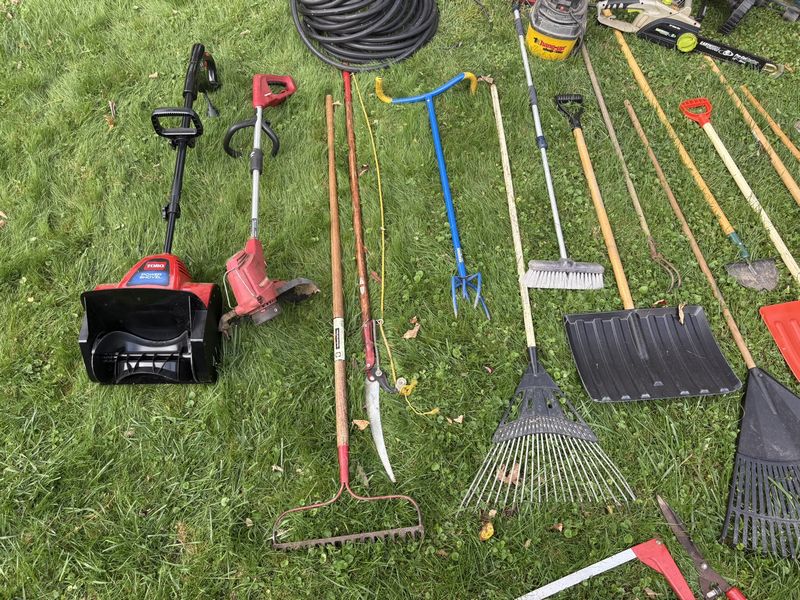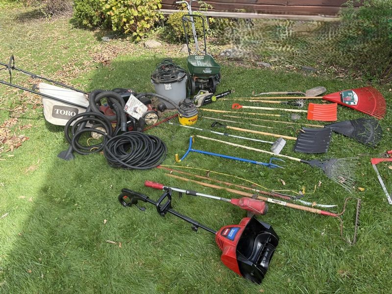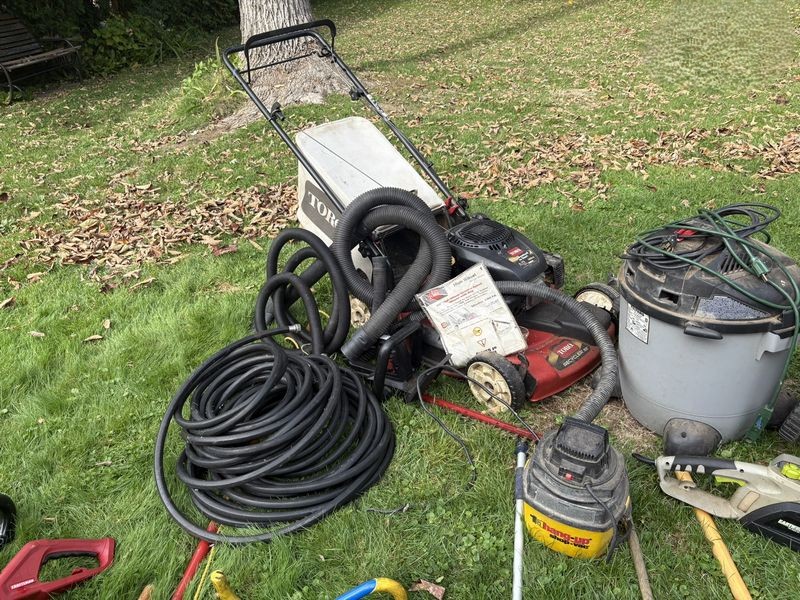 Lawn and Garden Tools. Including Toro lawnmower; antique saw; edger; power shovel; other related items. Loc in garage.