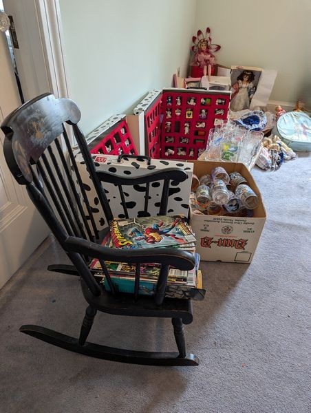 Children's Collectibles, featuring Disney, Marvel, DC Comics. Child's wood rocking chair; assorted collectibles including "101 Dalmatians" Happy Meal collection box set #31510; Disney & Star Wars glasses; Marvel & DC Comic books; Paradise Galleries dolls; Barbie carry case; more!. See photo for details. Loc on 2nd fl.