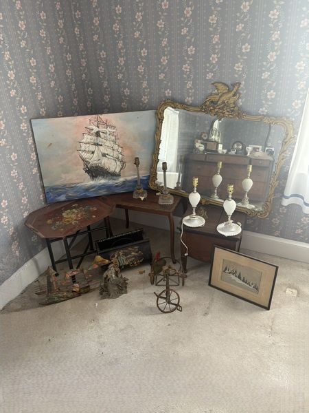 Antiques, Mixed Items. Including ship painting, 3'Wx26"H; metal removable tray table, 2'Wx17.5"Dx19.5"H; commode, 16"sq x16.5"H; mirror, 3'x34". Loc on 2nd fl.