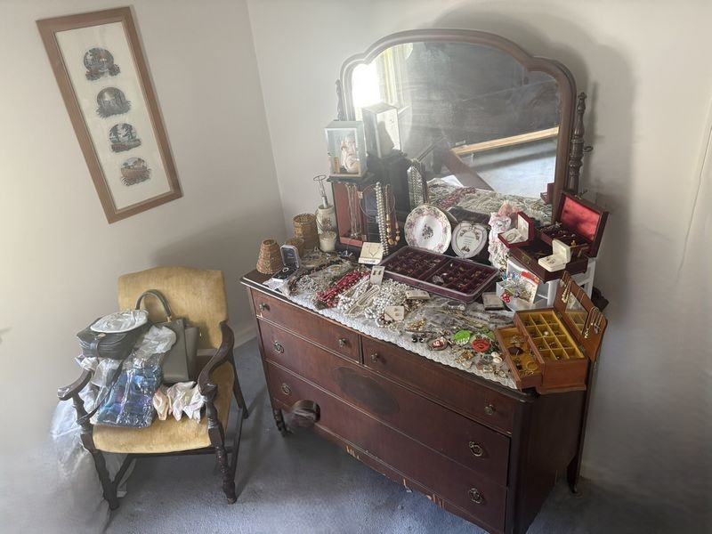 Vintage Furniture and Jewelry. Including dresser, 4'Wx22'Dx3'H with dovetailed drawers; mirror, 37"Wx32"H; boudoir chair, 2'Wx18"Dx32"H; wall art, 33"Wx18"H; large quantity costume jewelry. Loc on 2nd fl.