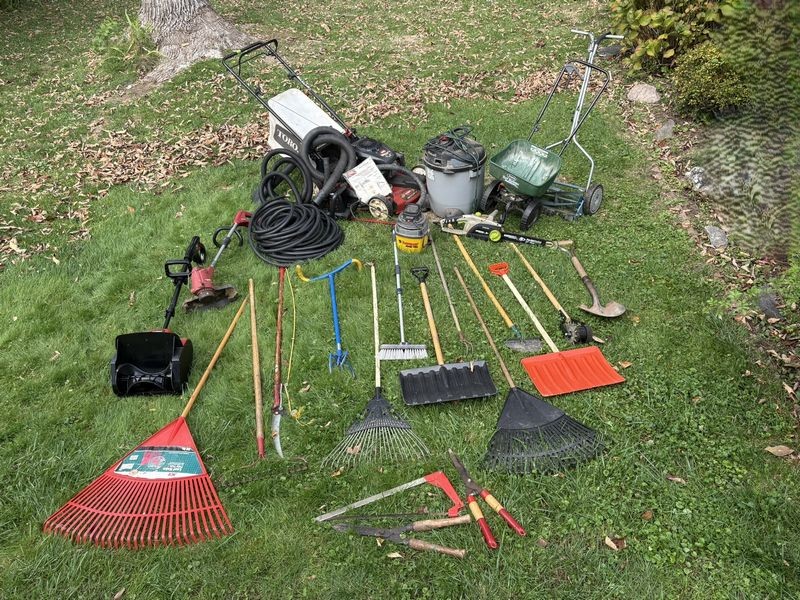 Lawn and Garden Tools. Including Toro lawnmower; antique saw; edger; power shovel; other related items. Loc in garage.