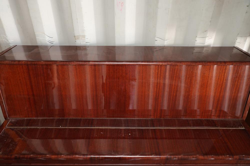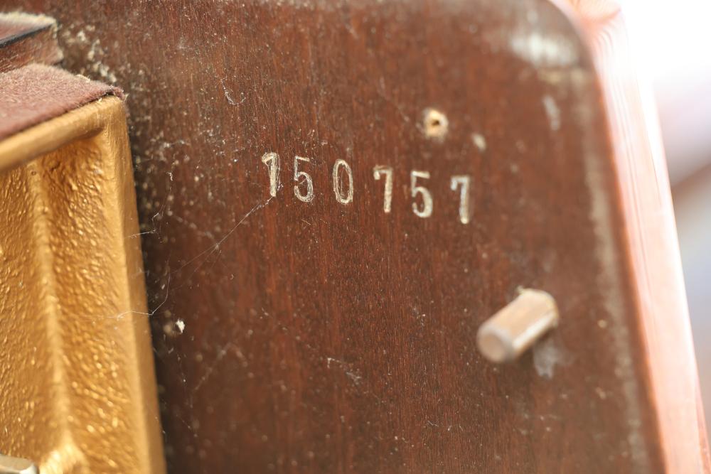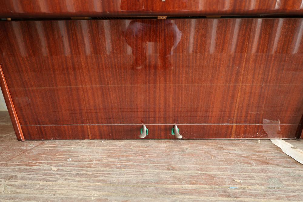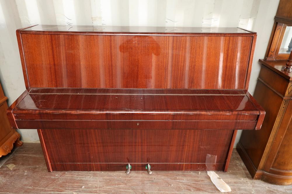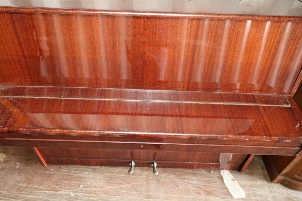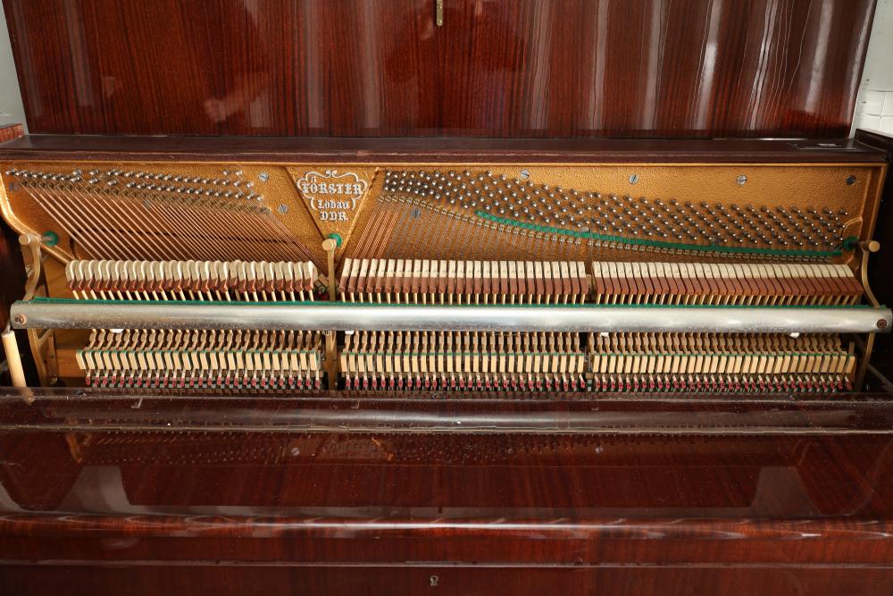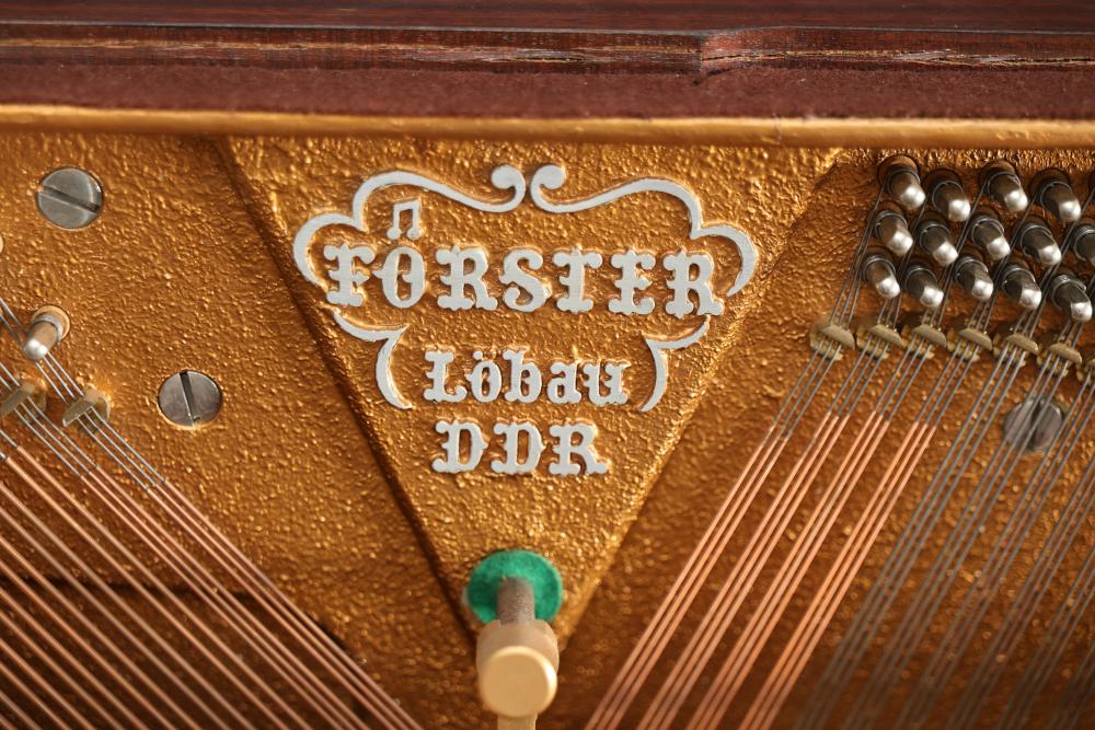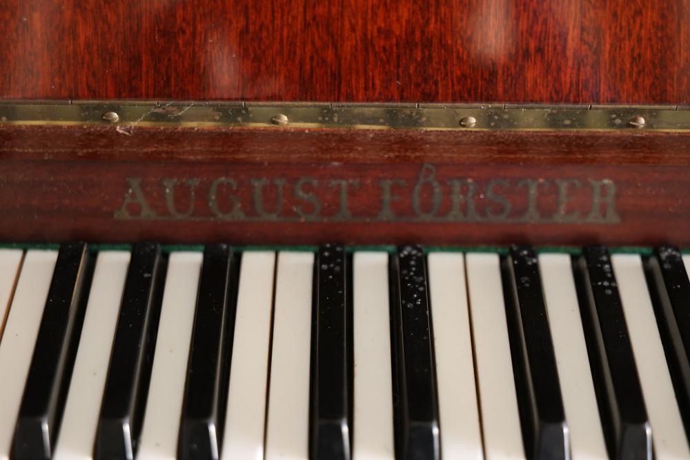 August Forster Upright Piano with Two Pedals. Features a polished wooden finish and traditional upright design, showcasing craftsmanship and detailing. Includes a standard keyboard layout with black and white keys. Serial number 150757 is visible on the internal mechanism. 61inchx24inchx46inch. Pickup only.