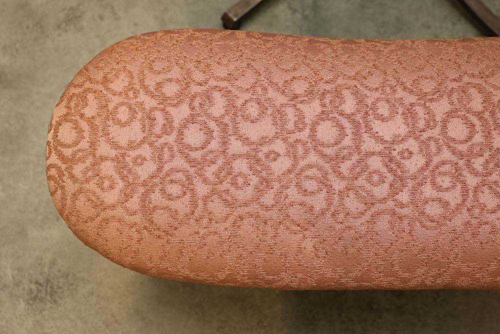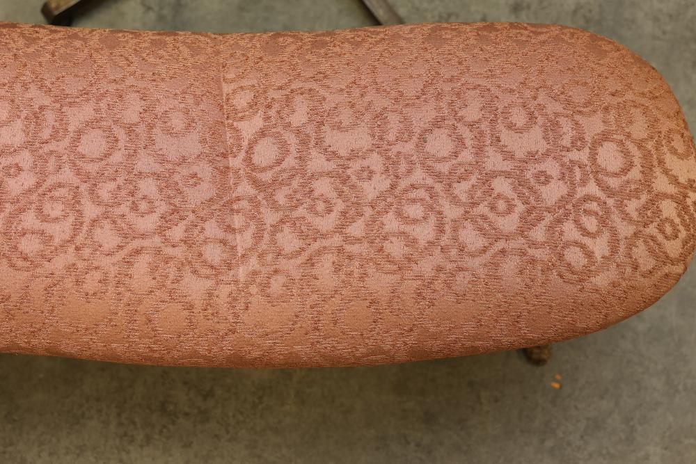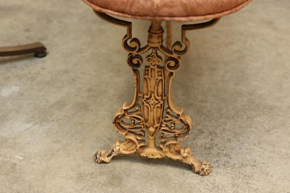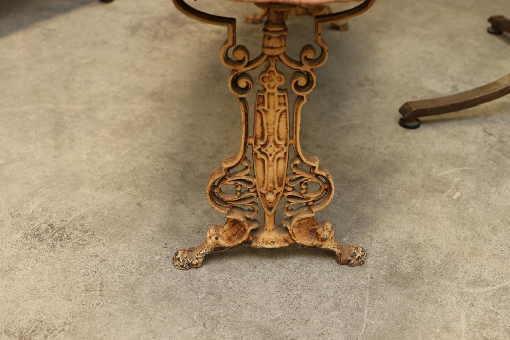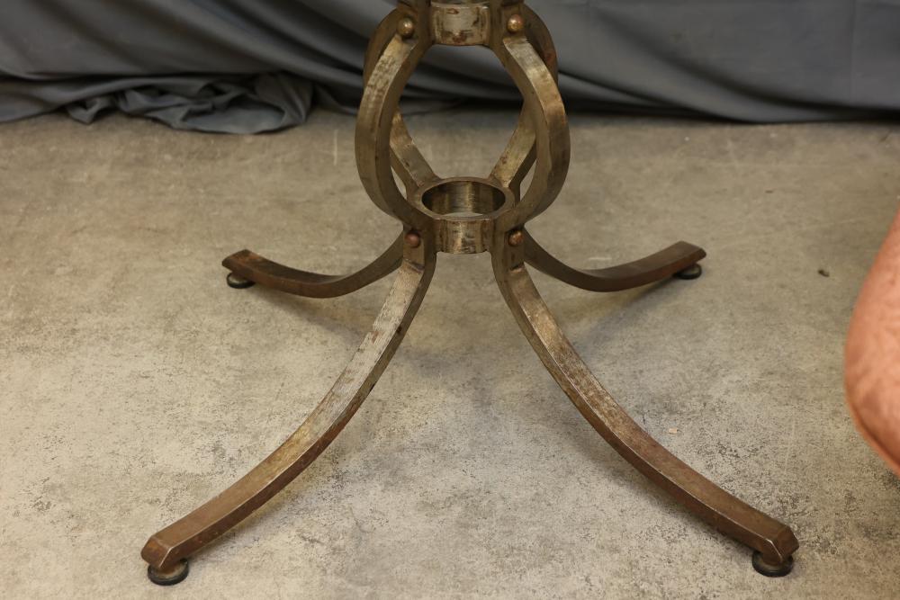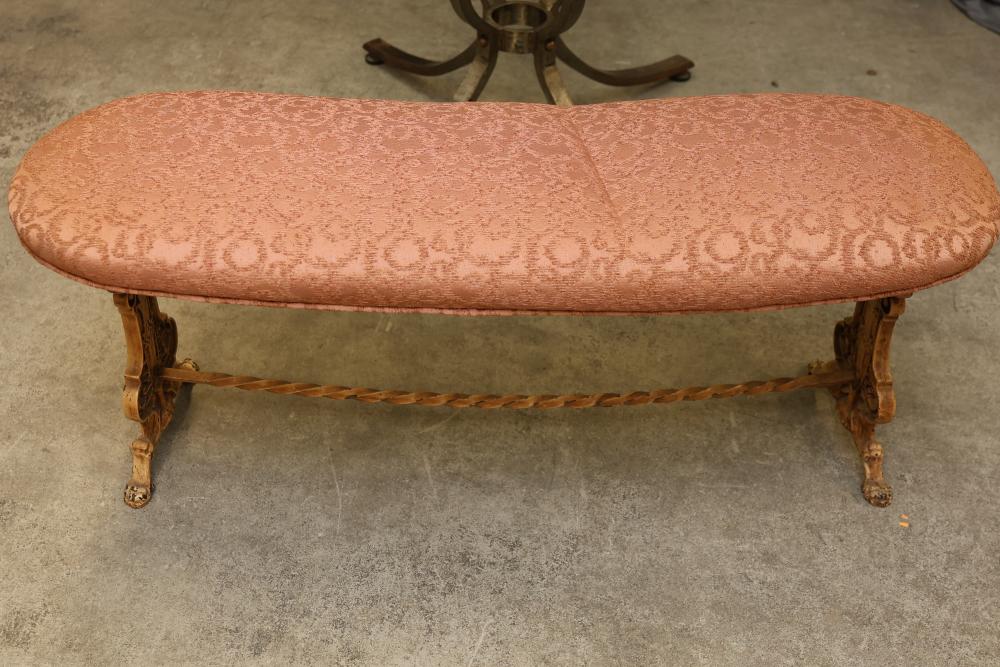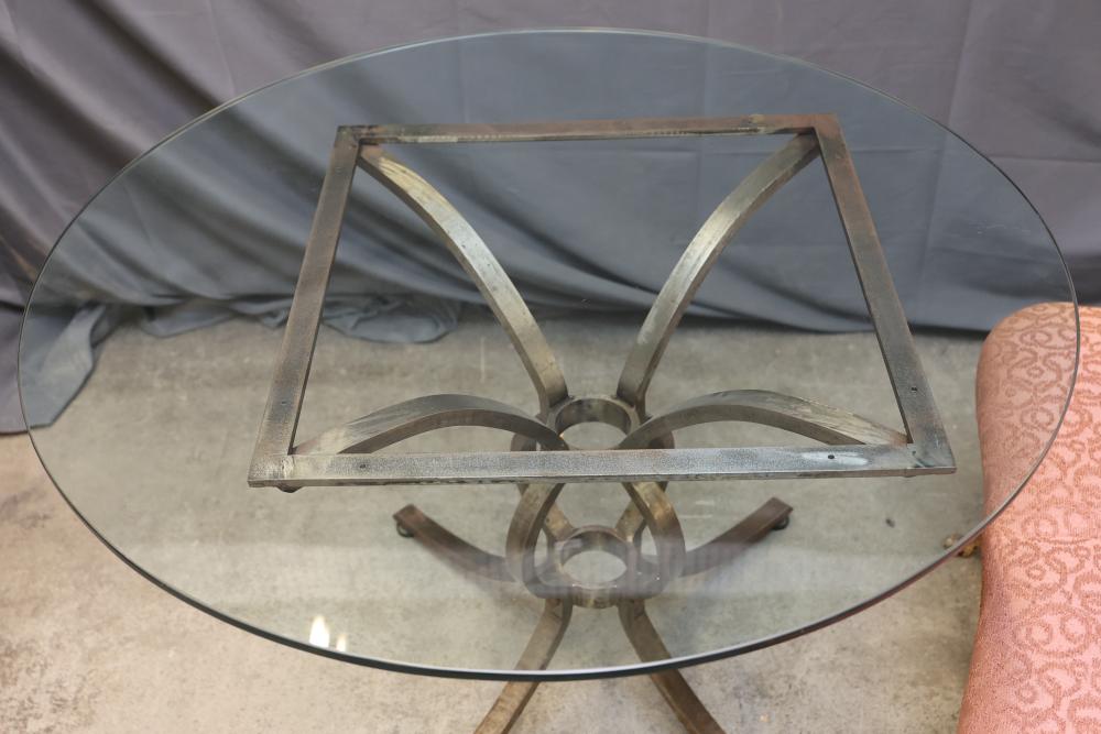 Glass-Topped Metal Table 42-inchDiameter x 28-inchH base with Upholstered Bench 17-inch43-inch12-inch. Includes a round glass table with a sculptural metal base and an upholstered bench featuring ornate metal legs and a textured fabric seat. Suitable for various settings. Pickup only.