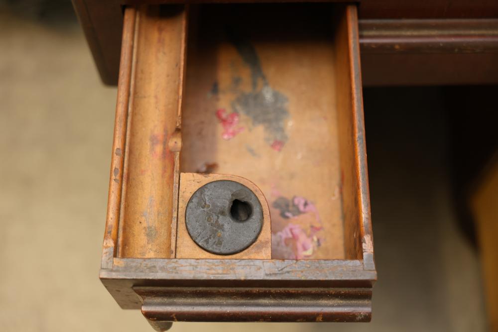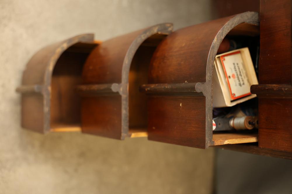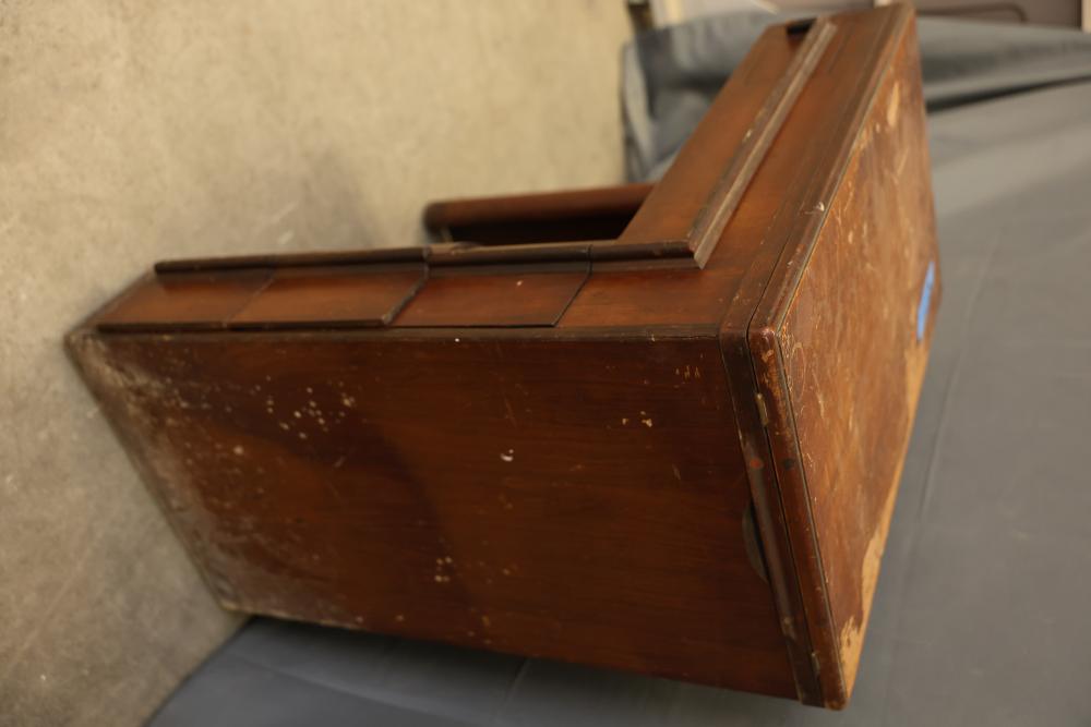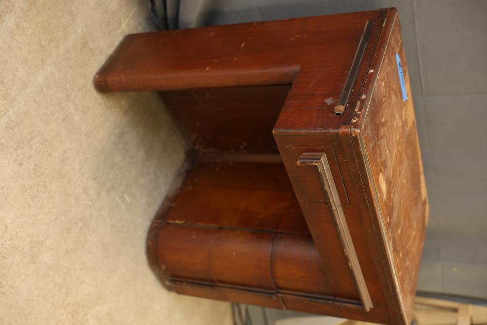 Wood sewing table with curved drawer design and additional storage. Features multiple drawers for organization. Measures 29 x 17 x 31 as noted. Pickup only.