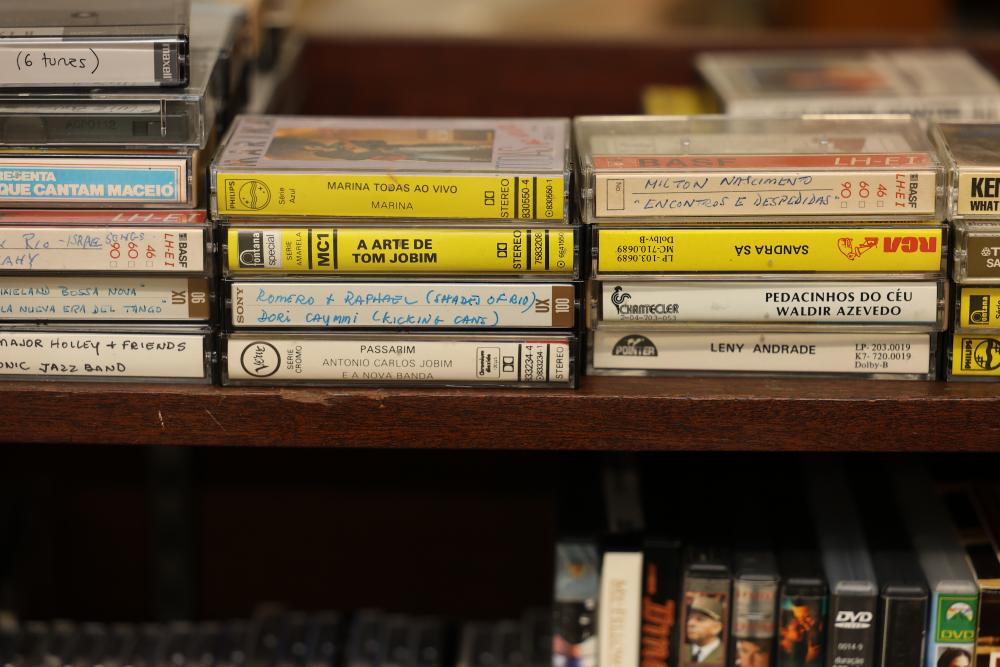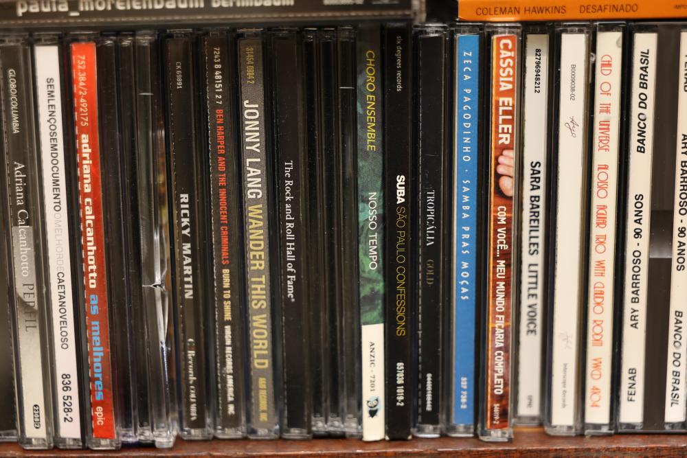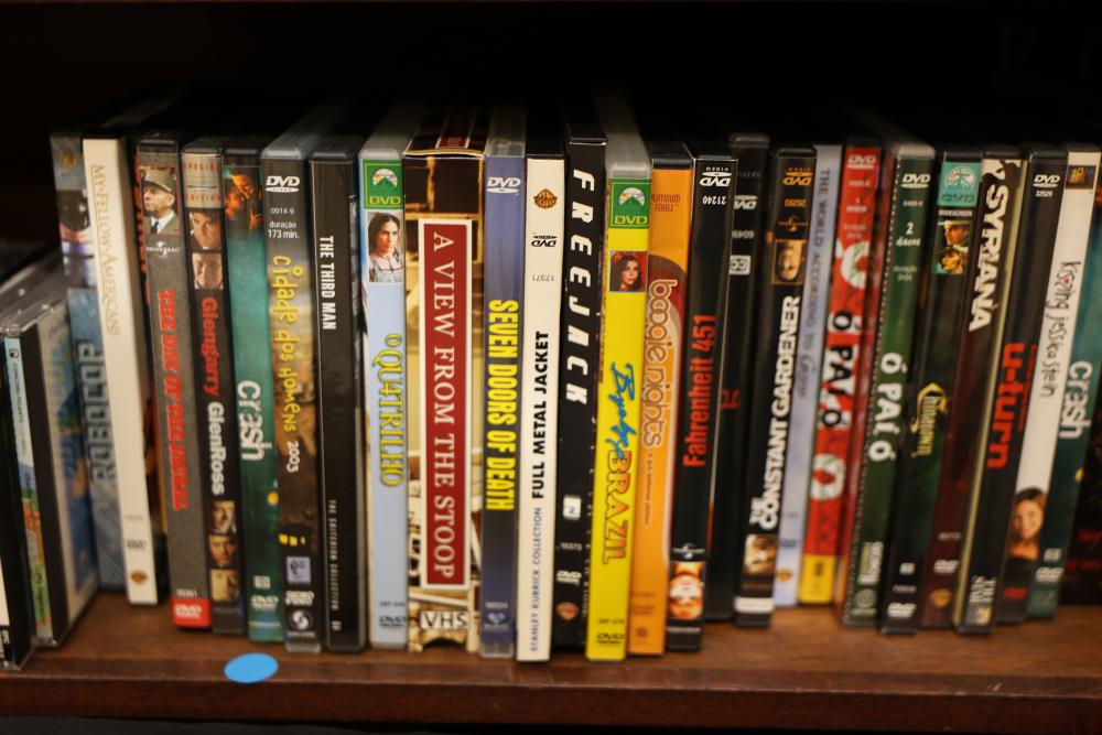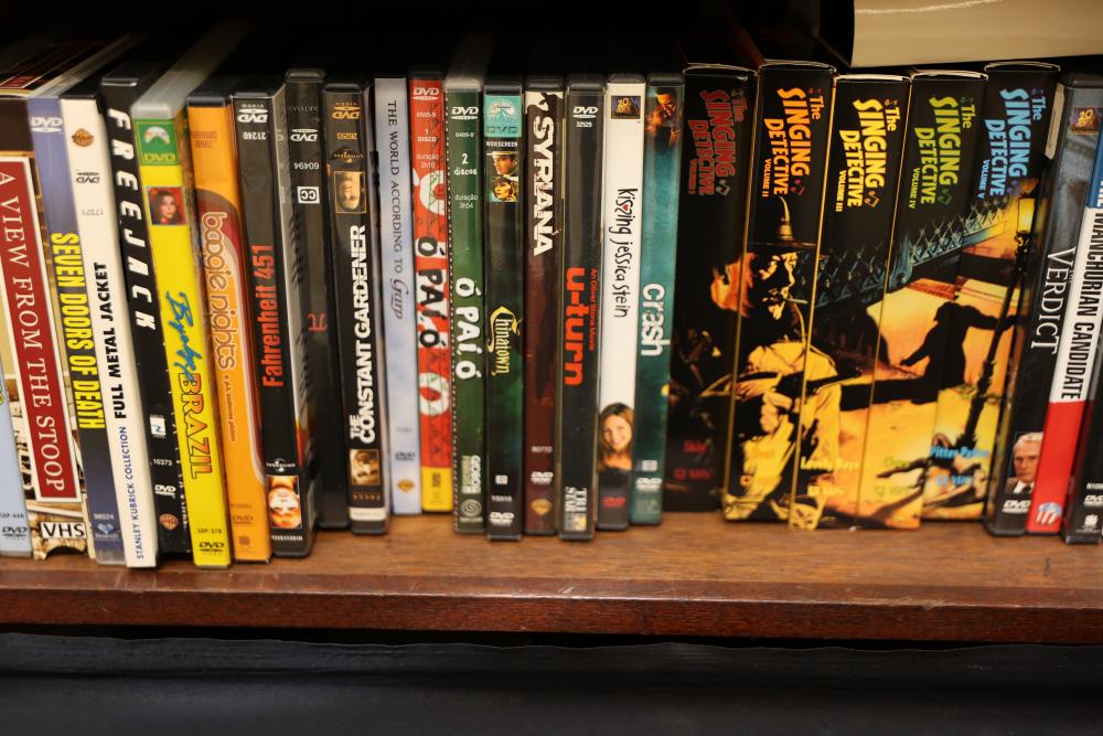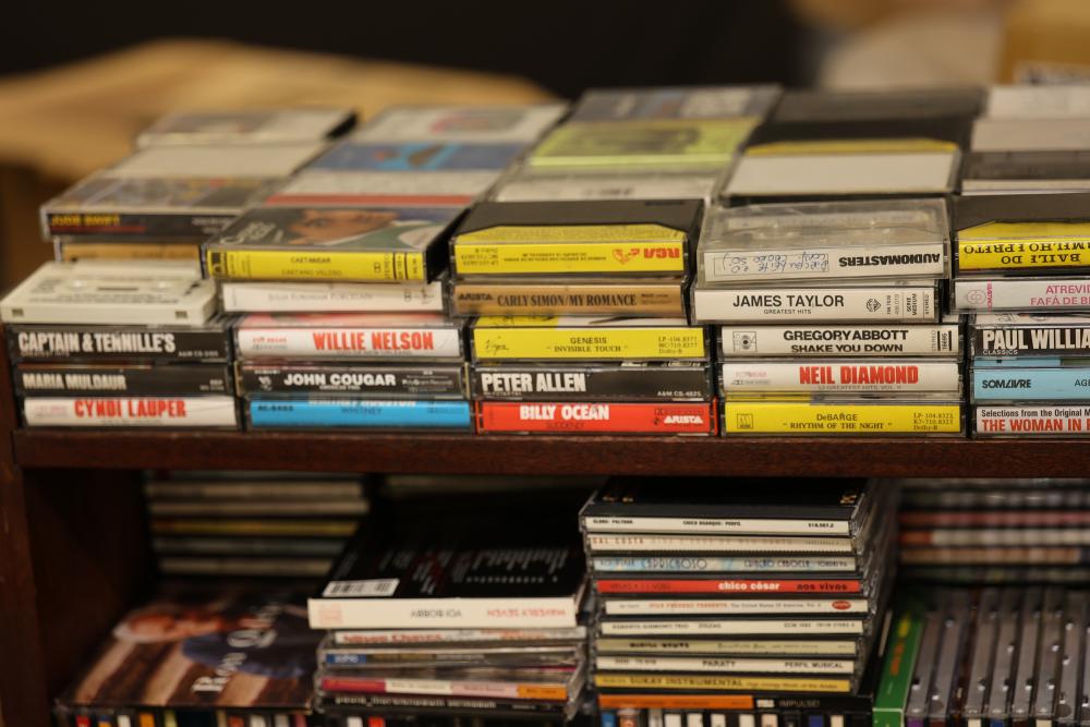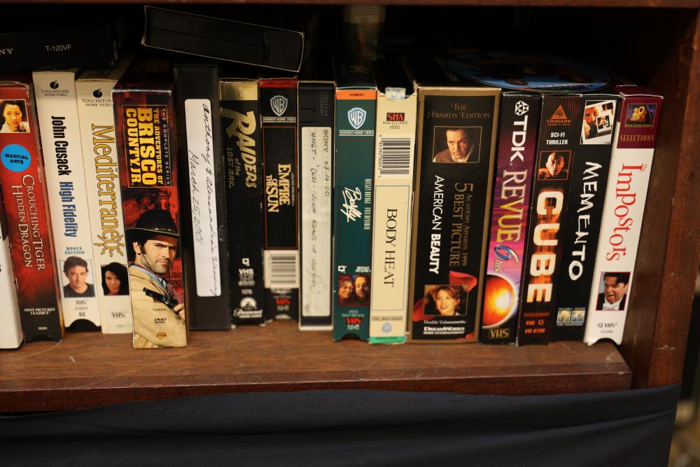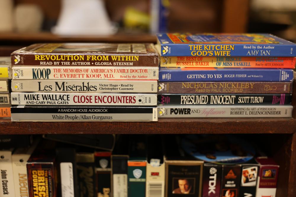 CDs, VHS Tapes, DVDs, and Audiobooks on Wooden Shelving. CDs include a variety of genres and artists across multiple albums. VHS tapes and DVDs feature various movies and programs. Audiobooks include titles from multiple authors. The items are displayed on a wooden shelving unit with multiple compartments. Pickup only.