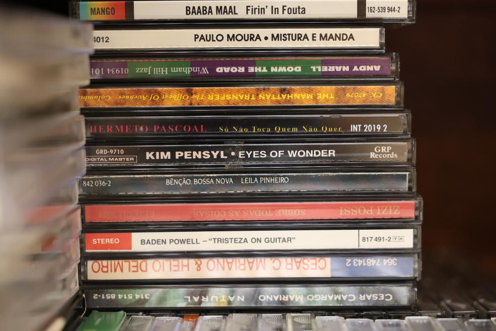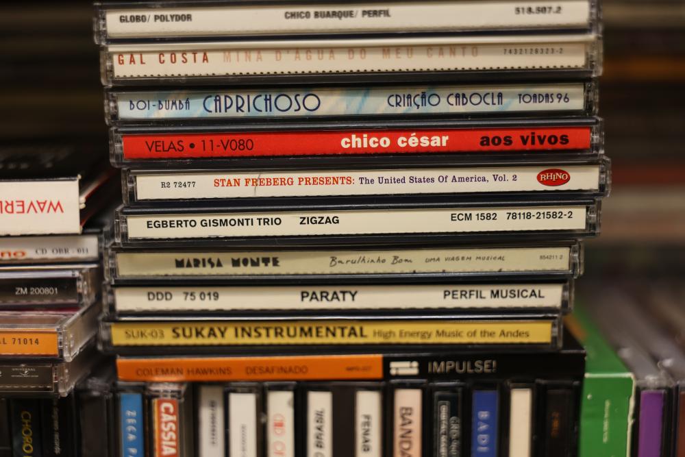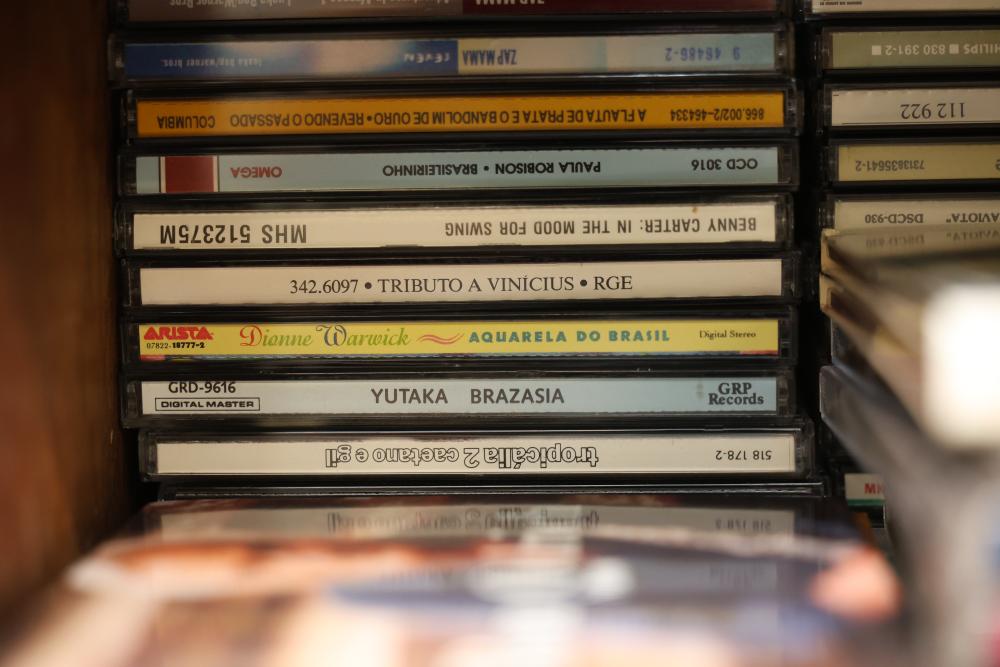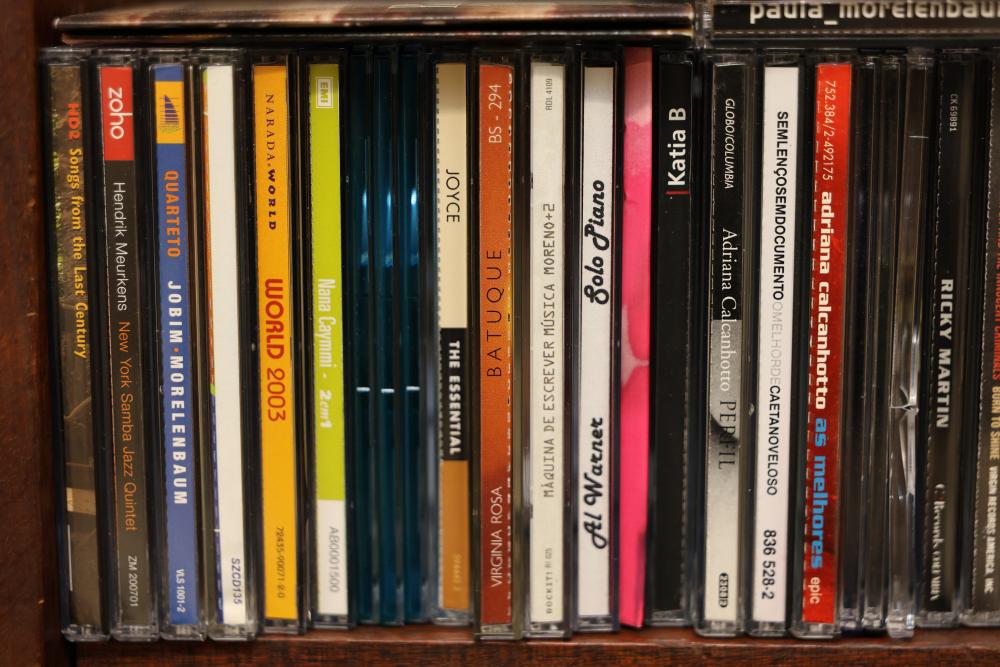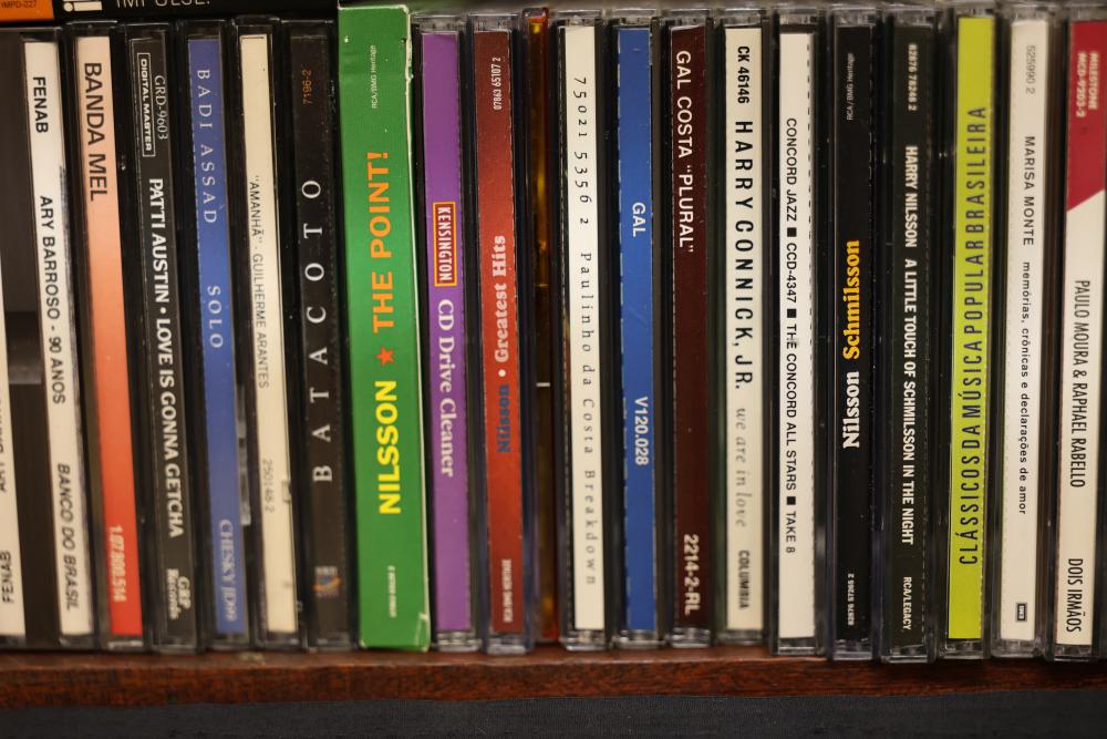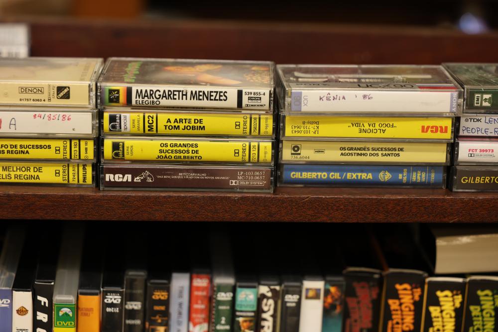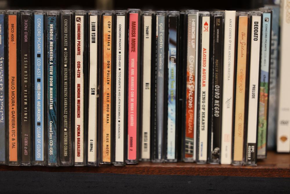 CDs, VHS Tapes, DVDs, and Audiobooks on Wooden Shelving. CDs include a variety of genres and artists across multiple albums. VHS tapes and DVDs feature various movies and programs. Audiobooks include titles from multiple authors. The items are displayed on a wooden shelving unit with multiple compartments. Pickup only.