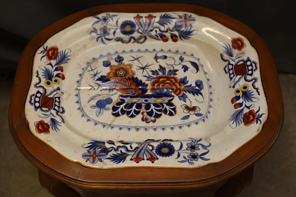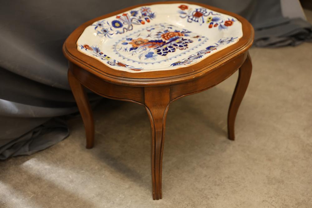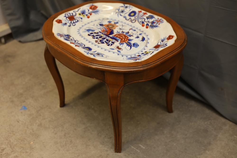 Wood Accent Table with Ceramic Floral Inlay Top, 24.5-inch x 20-inch x 18-inch. This piece features a stained wood frame with curved legs and a ceramic top that displays vibrant floral and decorative motifs. The ceramic surface adds a distinct and colorful element to the table's design. Pickup only.