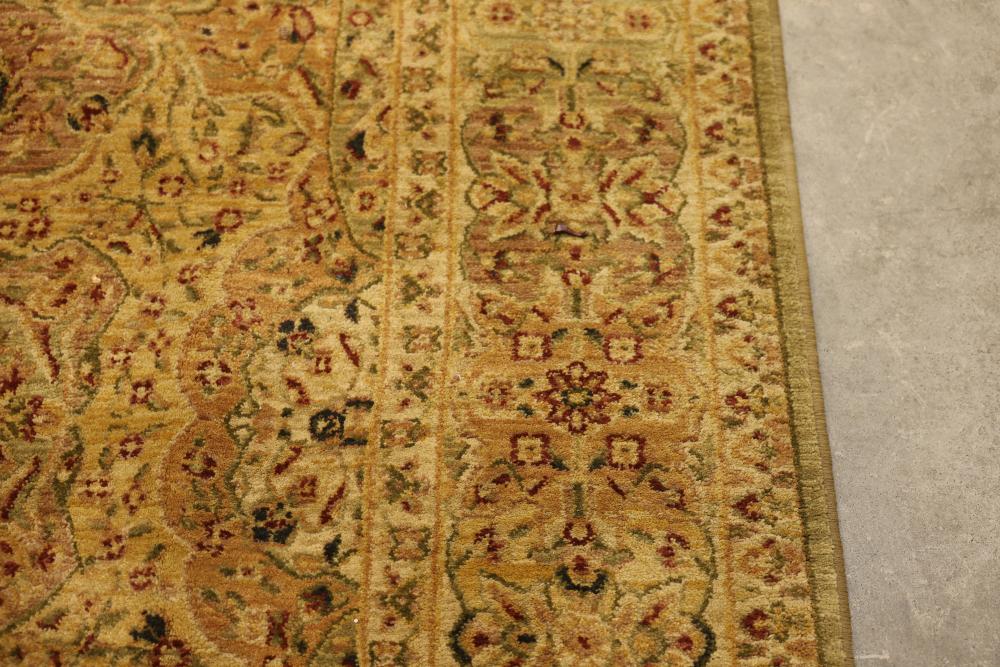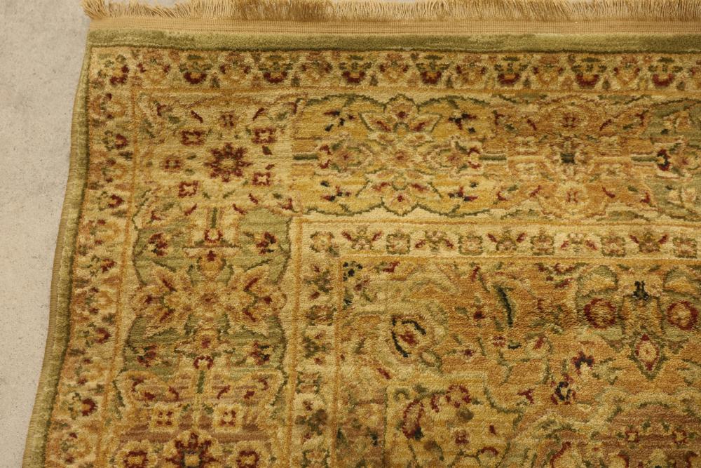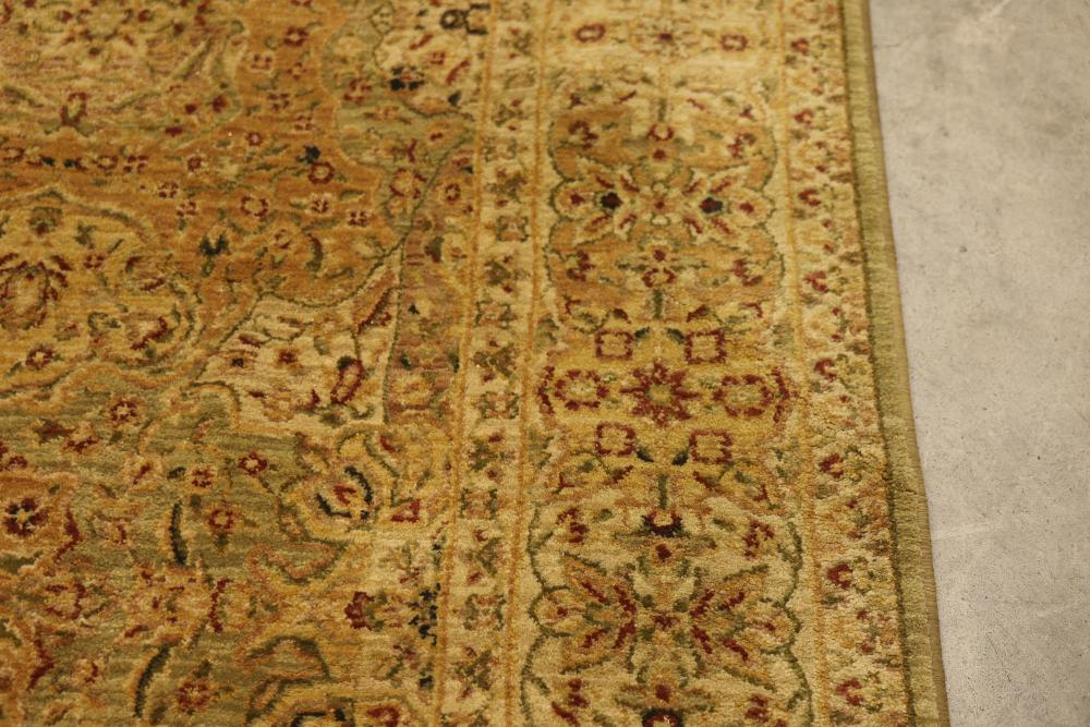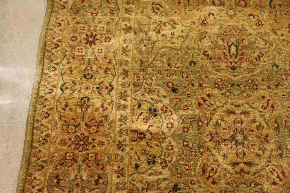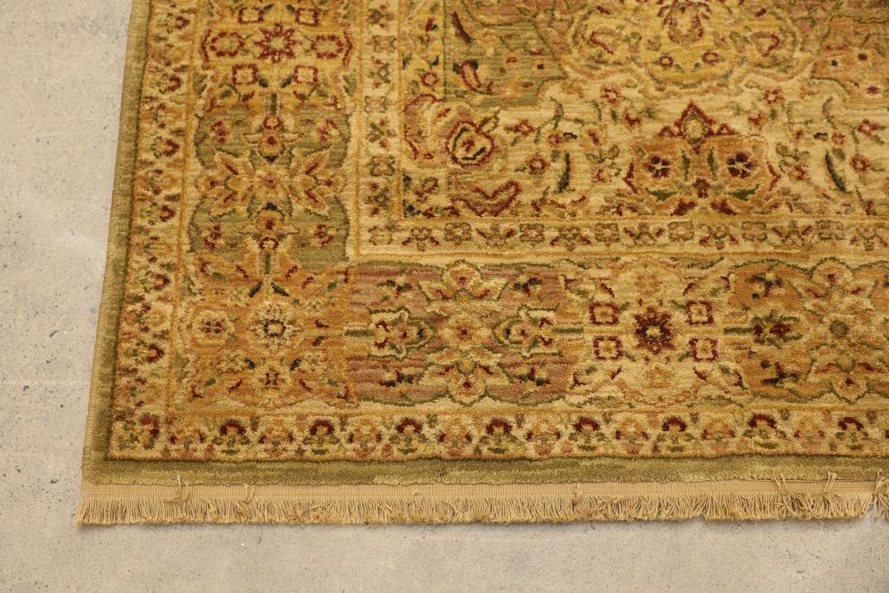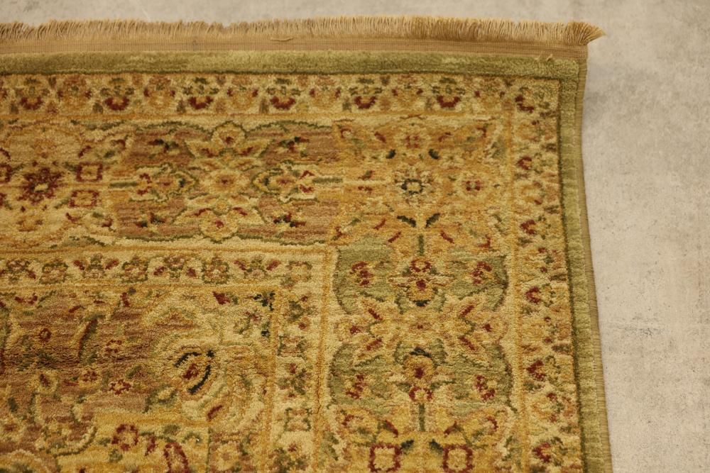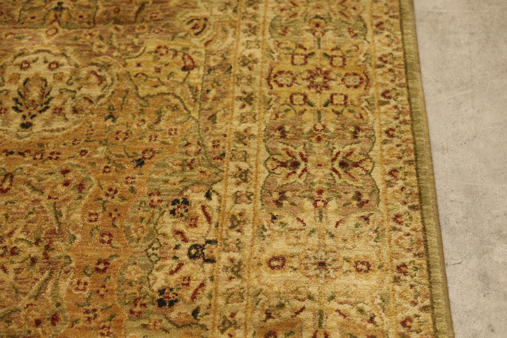 130-Inch Long x 93-Inch Wide Area Rug with Ornate Patterning. Features an intricate design in shades of gold, green, and red, with fine border details and fringe accents. Pickup only.
