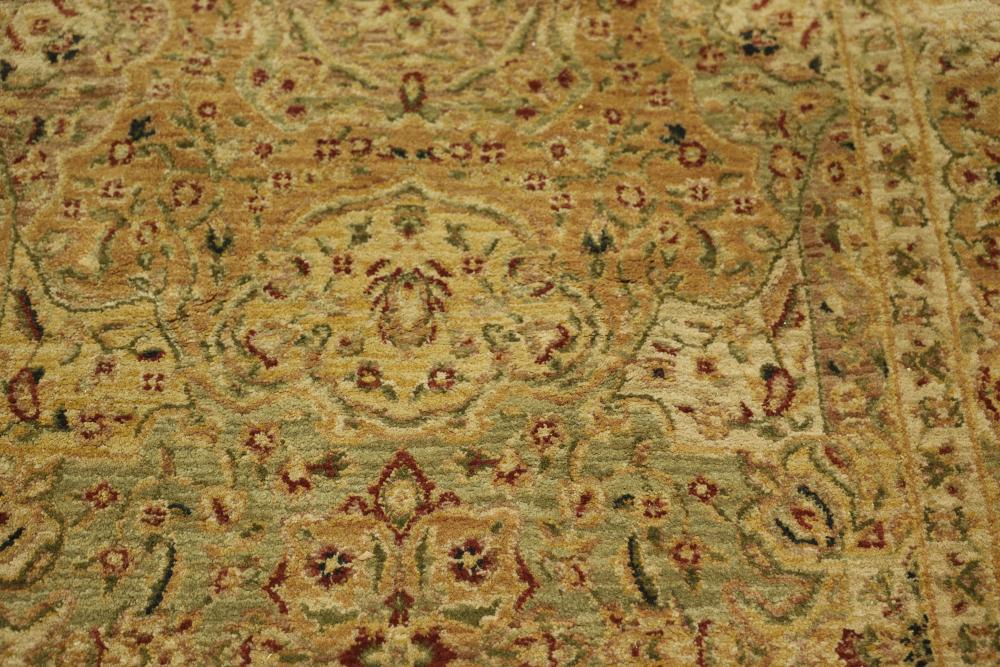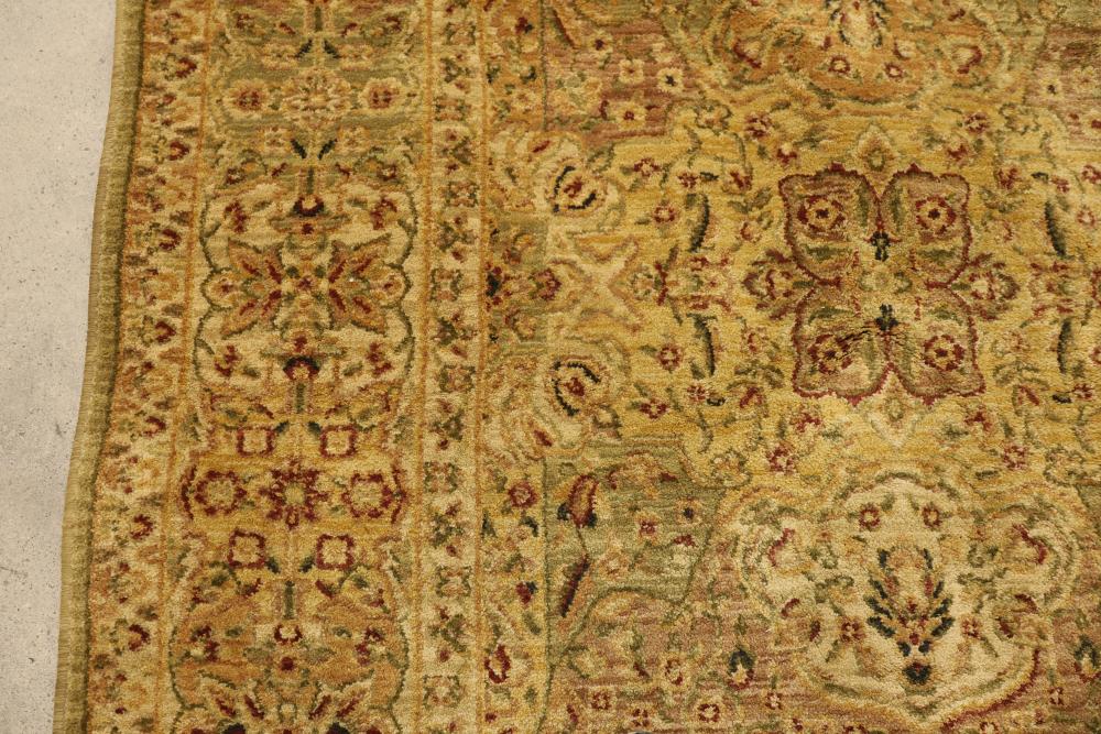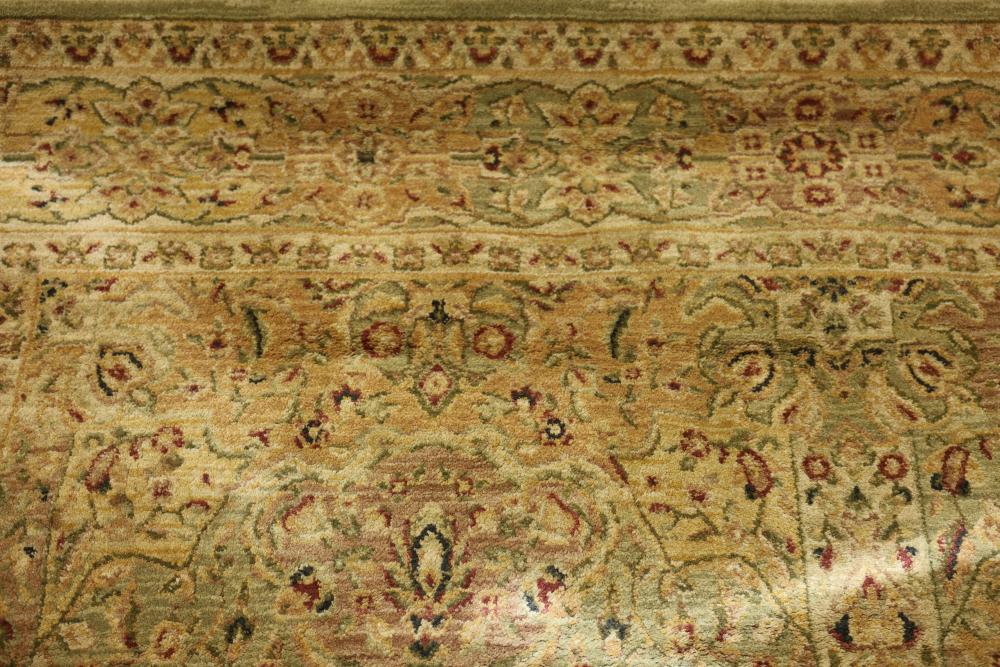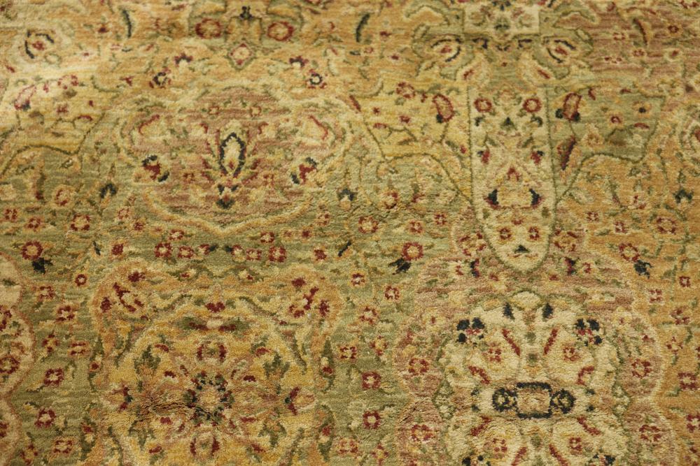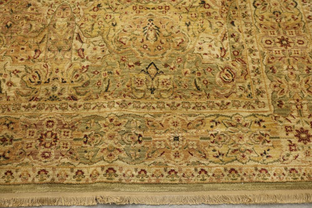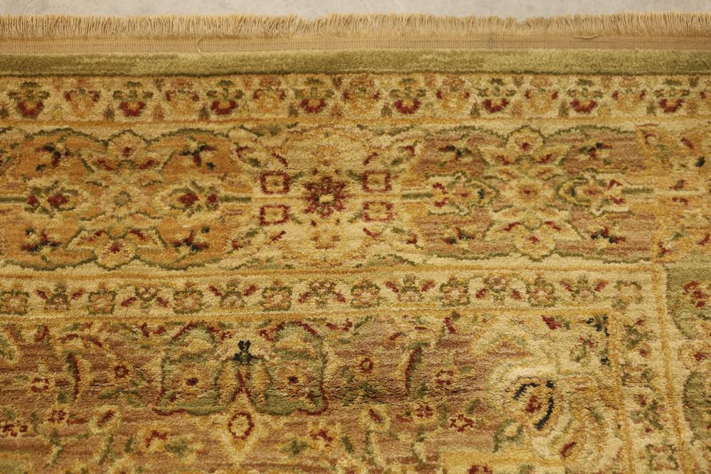130-Inch Long x 93-Inch Wide Area Rug with Ornate Patterning. Features an intricate design in shades of gold, green, and red, with fine border details and fringe accents. Pickup only.