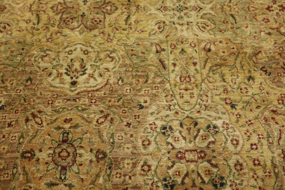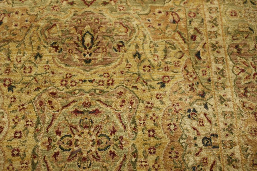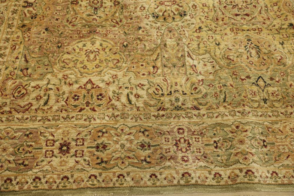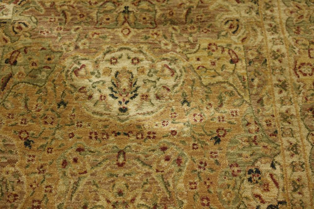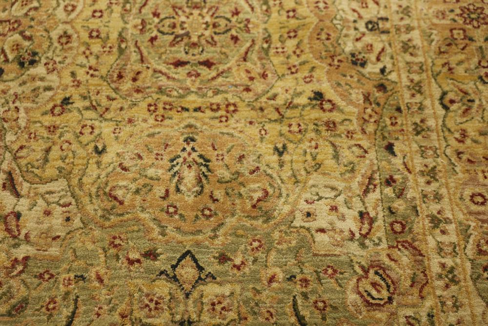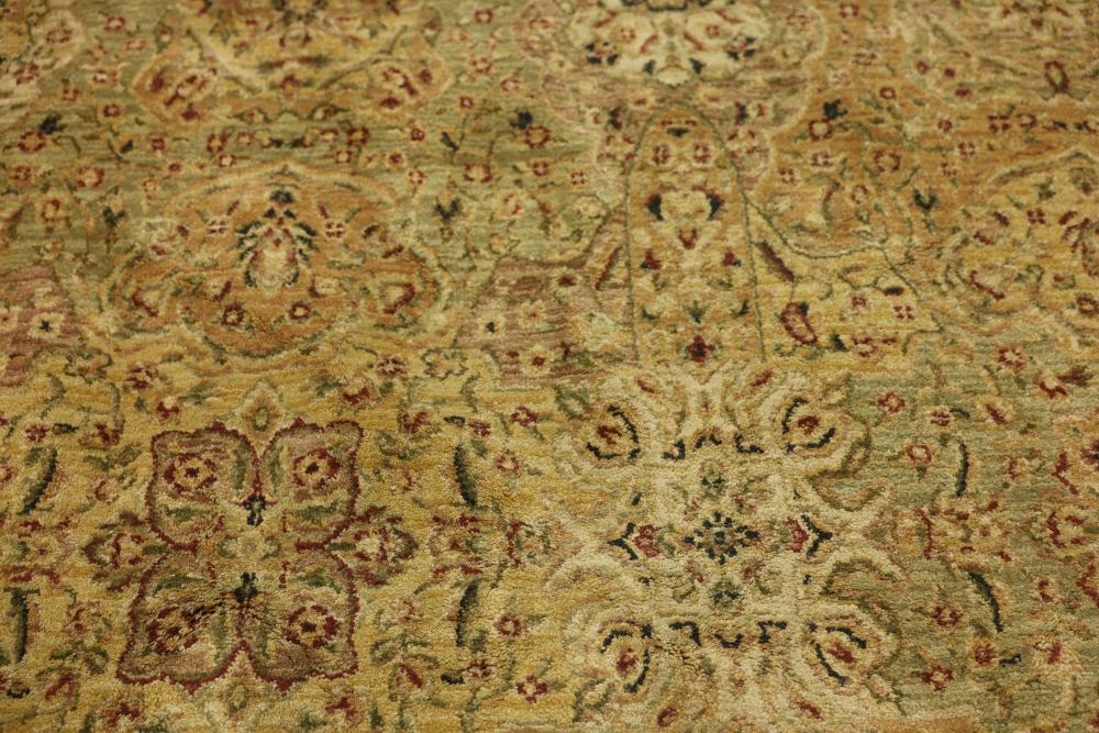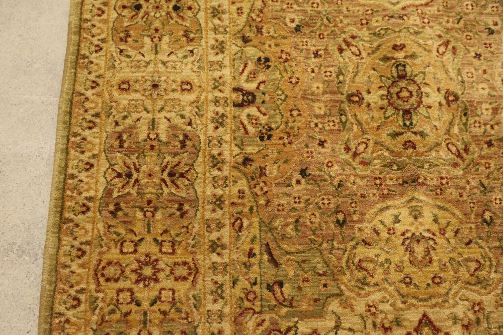 130-Inch Long x 93-Inch Wide Area Rug with Ornate Patterning. Features an intricate design in shades of gold, green, and red, with fine border details and fringe accents. Pickup only.