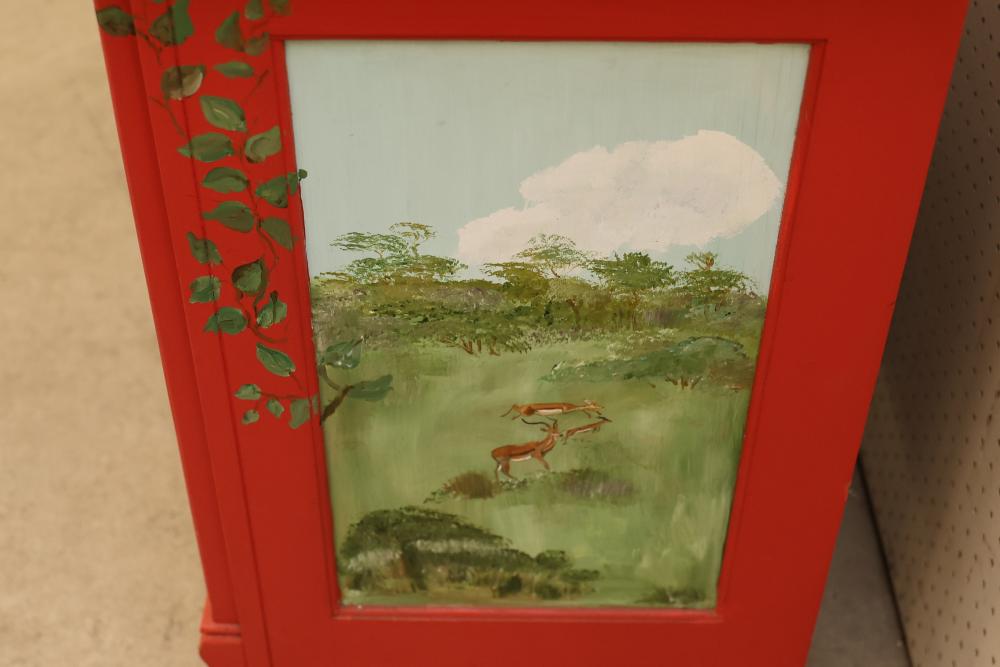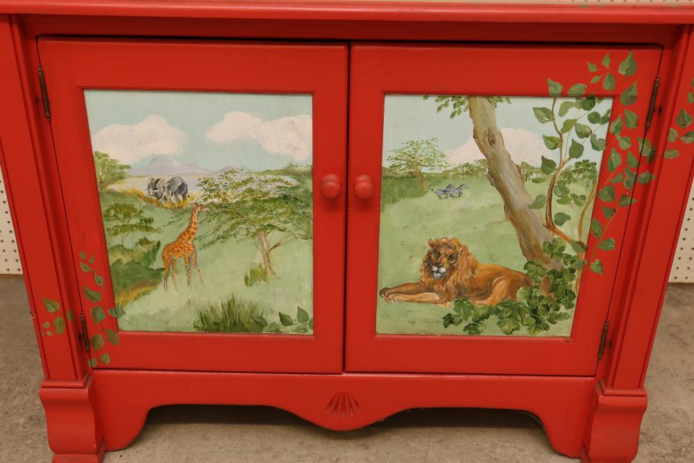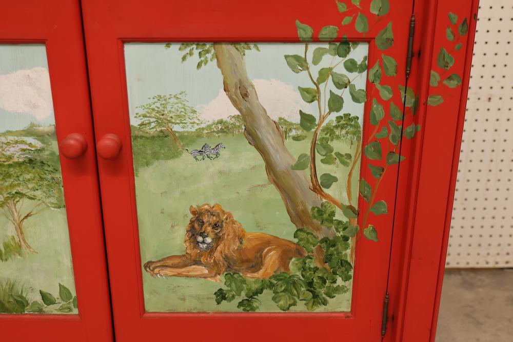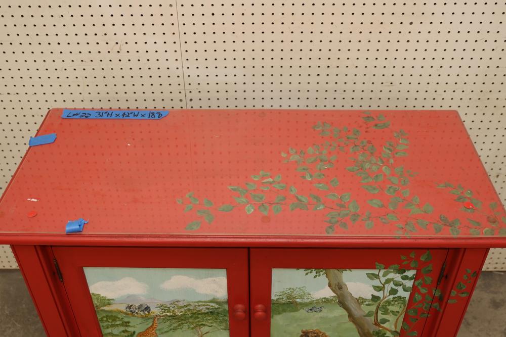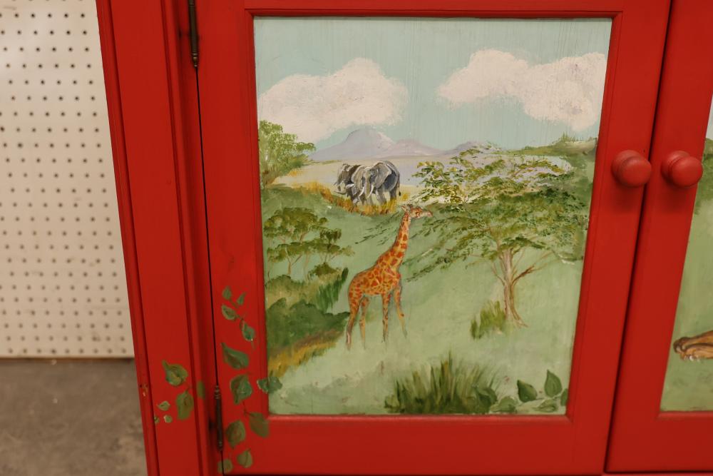 Red hand-painted wooden cabinet featuring safari animal designs, including lions, giraffes, and rhinoceroses, on the front panels and sides. The cabinet measures 31-inch H x 42-inch W x 18-inch D and includes two doors that open to reveal two interior shelves for storage. The top and sides feature vine design elements. Pickup only.
