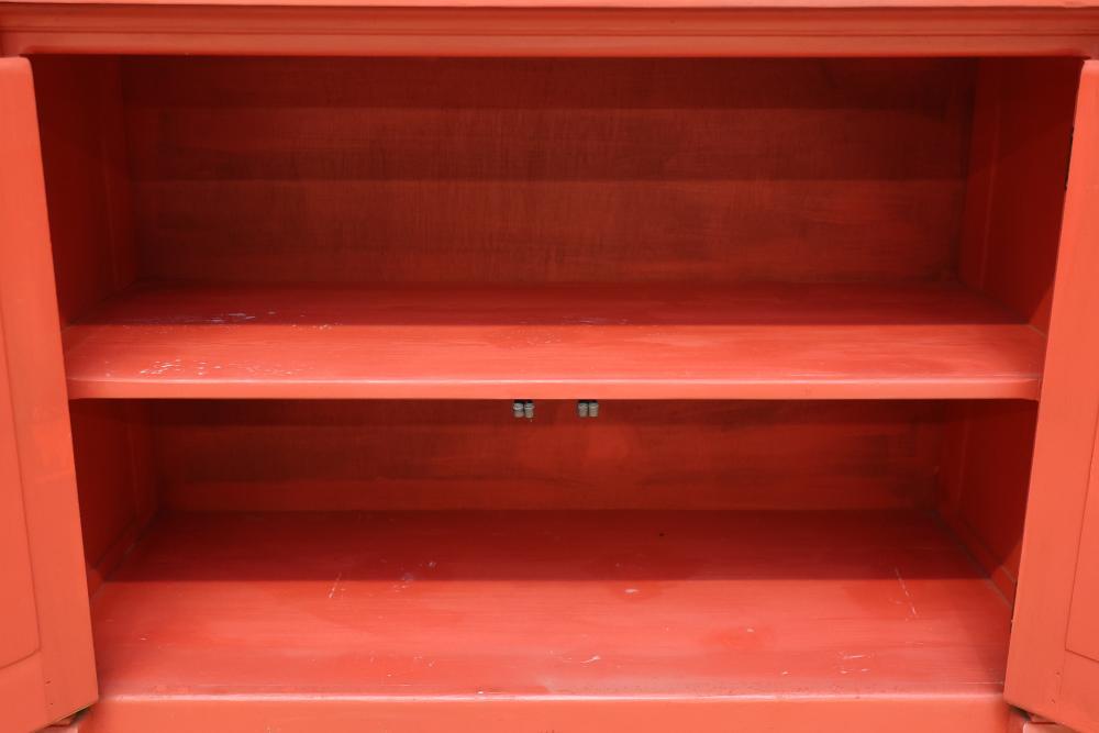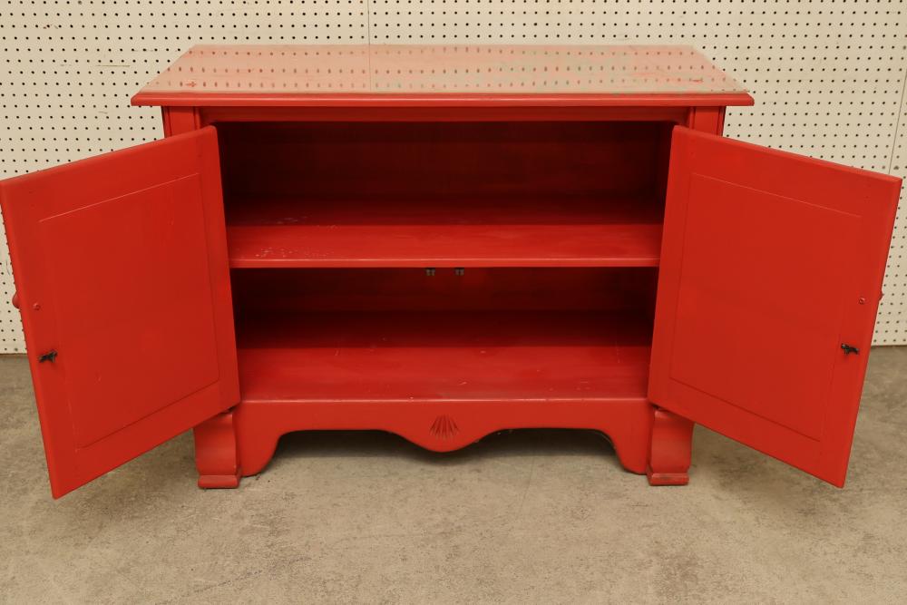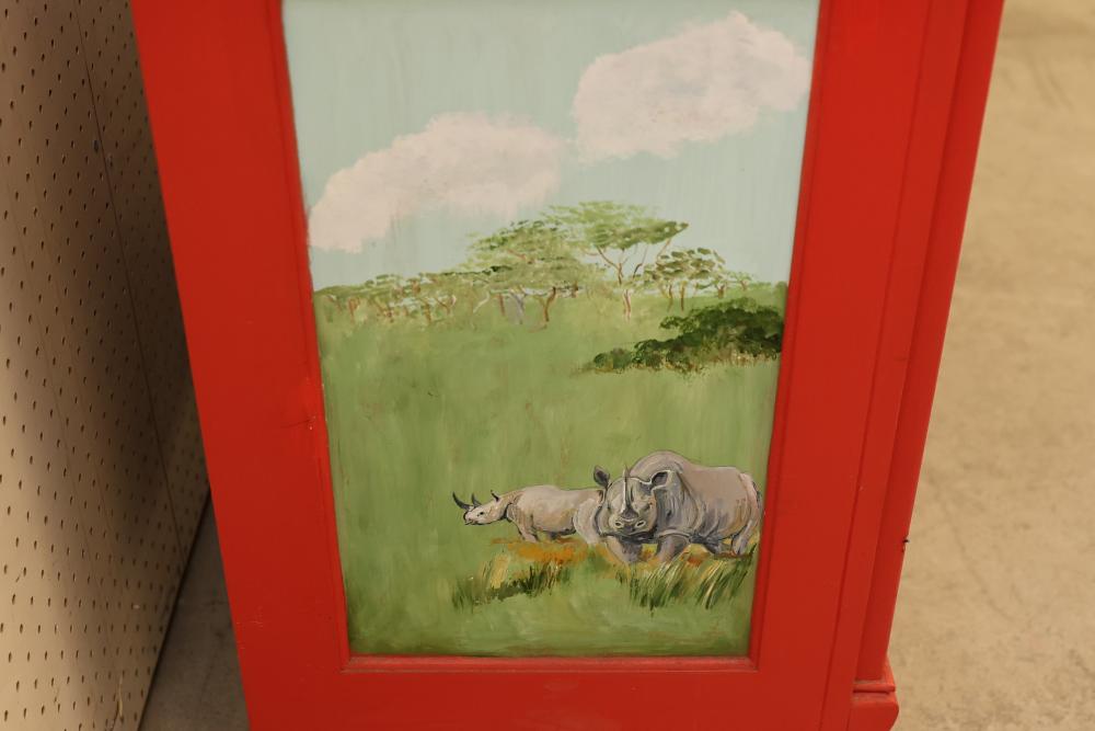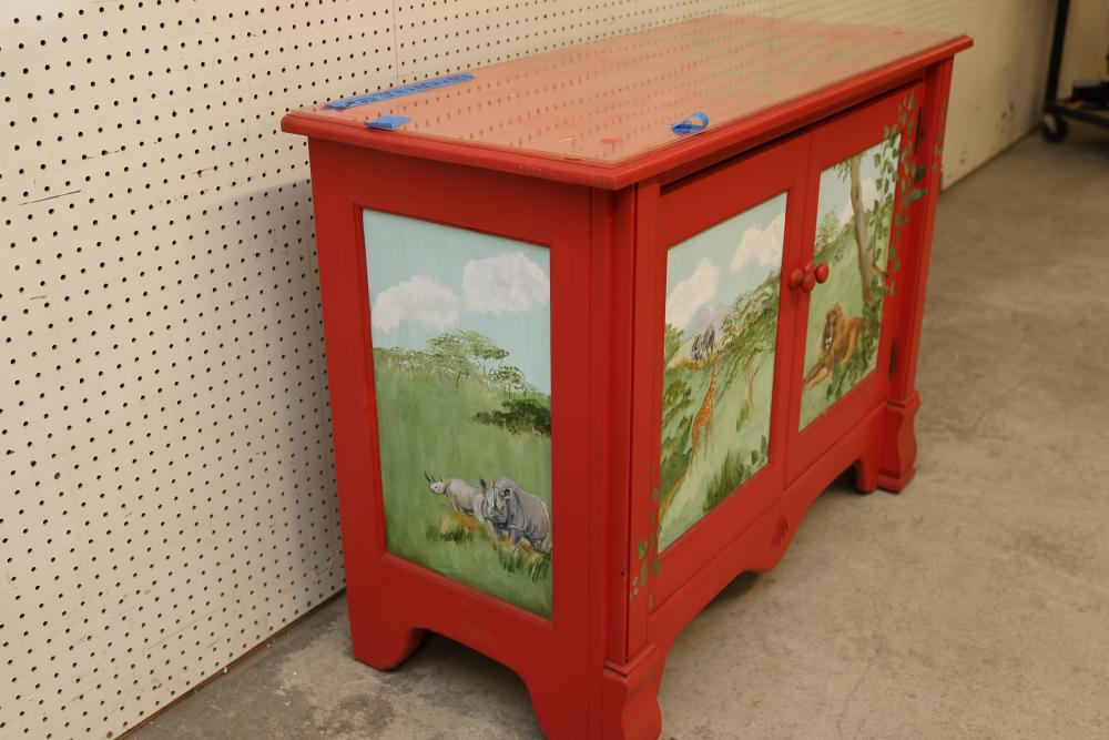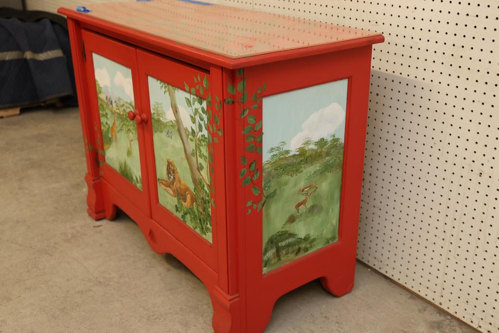 Red hand-painted wooden cabinet featuring safari animal designs, including lions, giraffes, and rhinoceroses, on the front panels and sides. The cabinet measures 31-inch H x 42-inch W x 18-inch D and includes two doors that open to reveal two interior shelves for storage. The top and sides feature vine design elements. Pickup only.