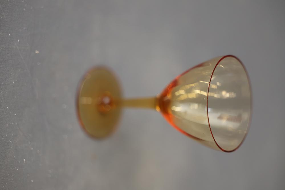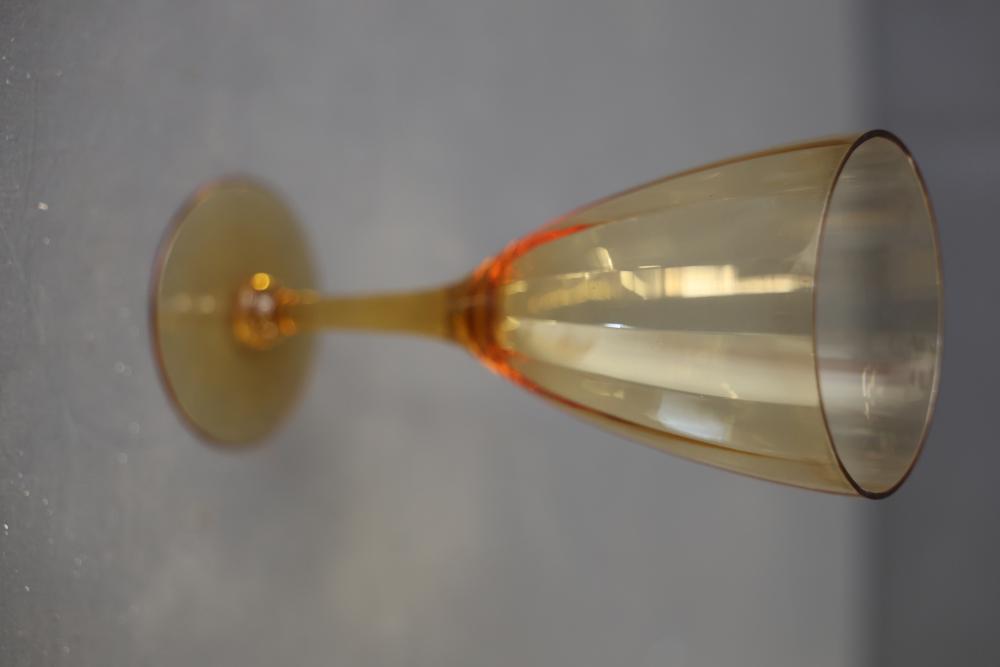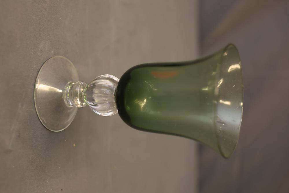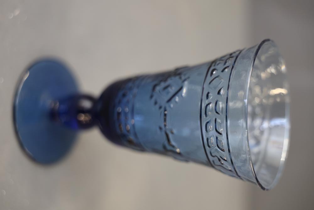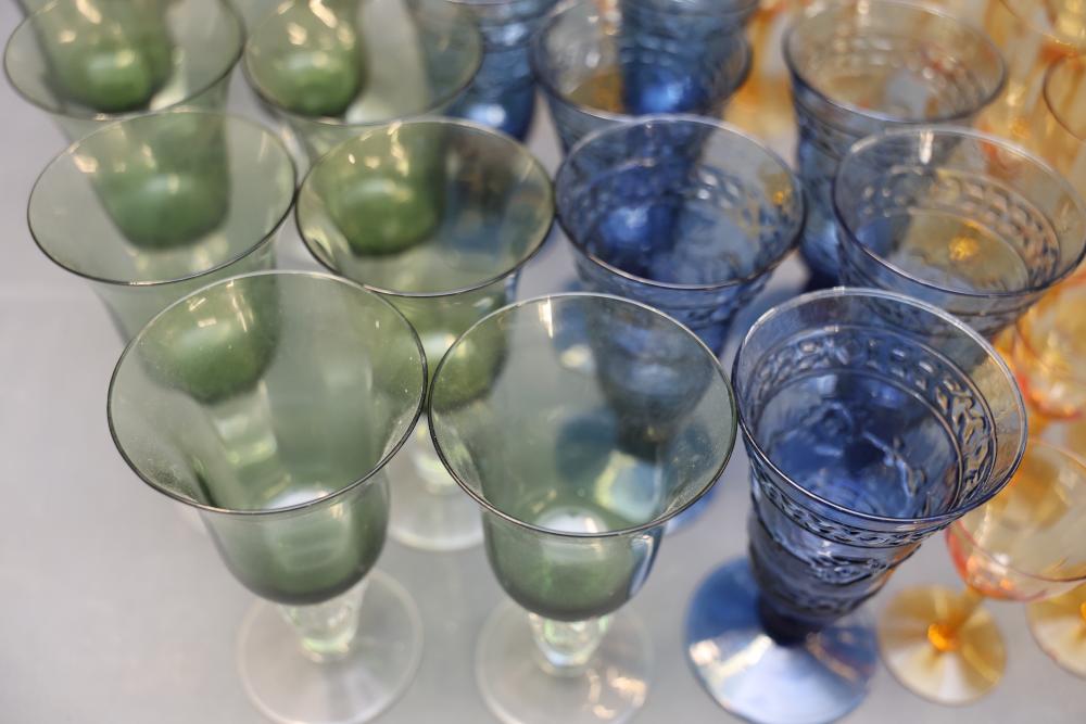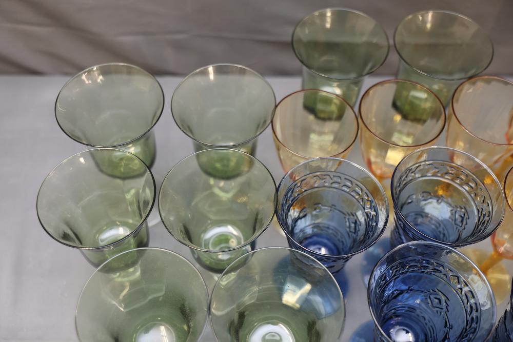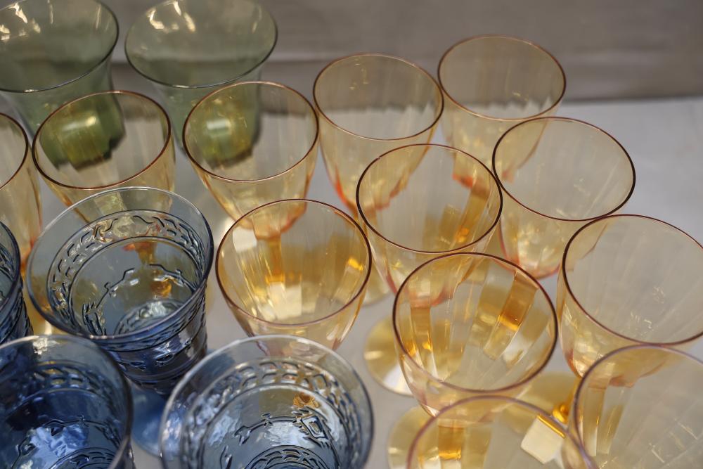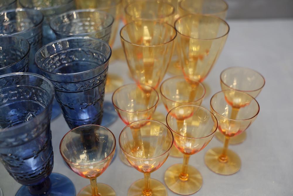 Glassware in Amber, Green, and Blue Tones. A selection of glasses in varying sizes and designs, featuring amber, green, and blue tones. The assortment includes goblets, stemmed glasses, and small cups. All pieces are crafted from glass with detailed patterns and finishes. Pickup only.