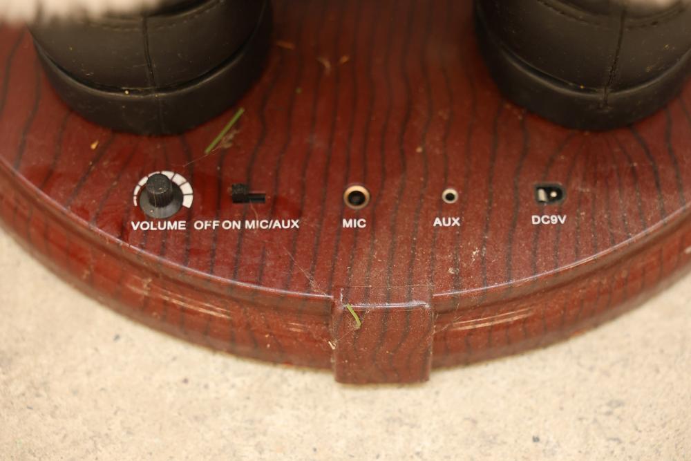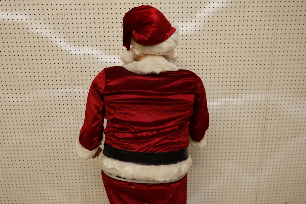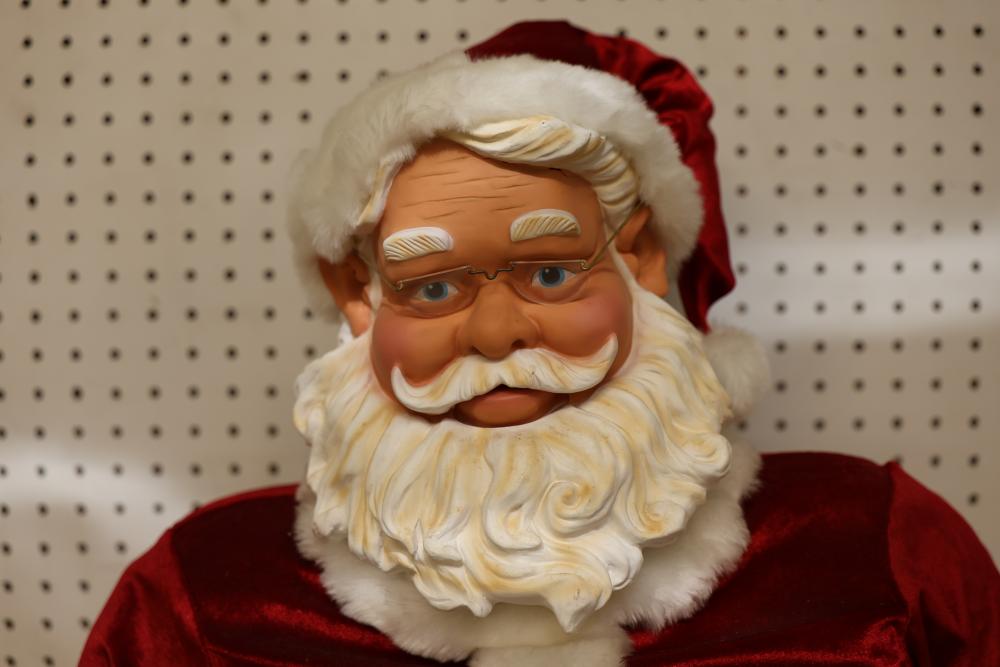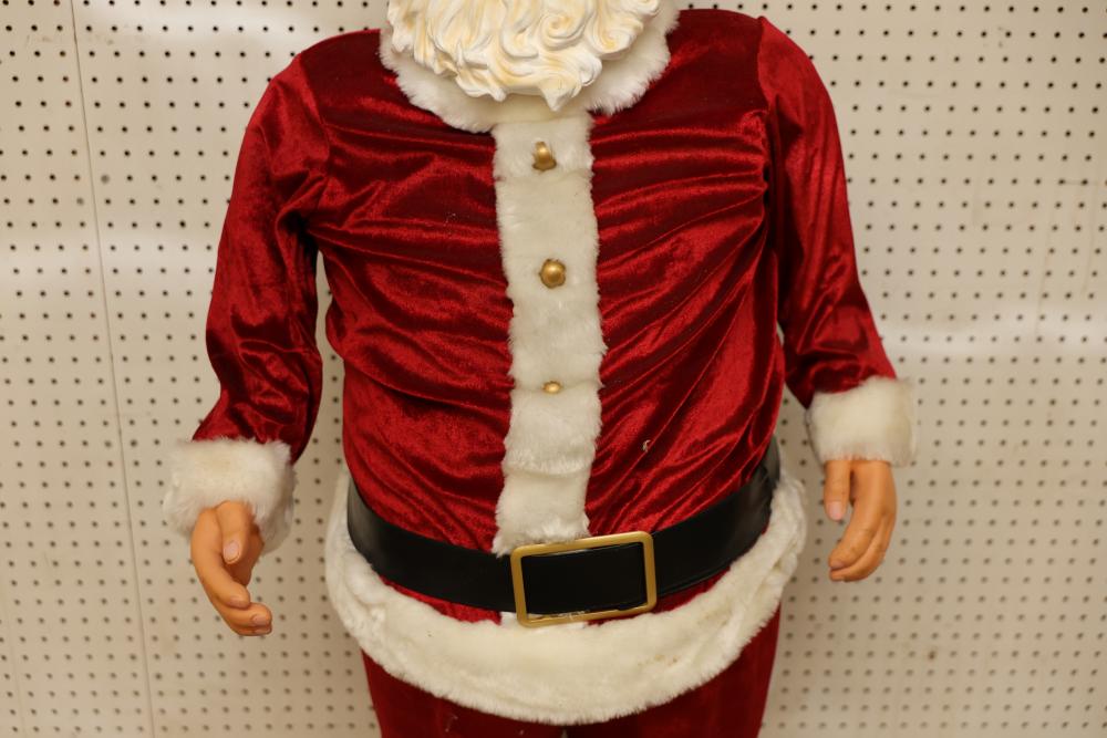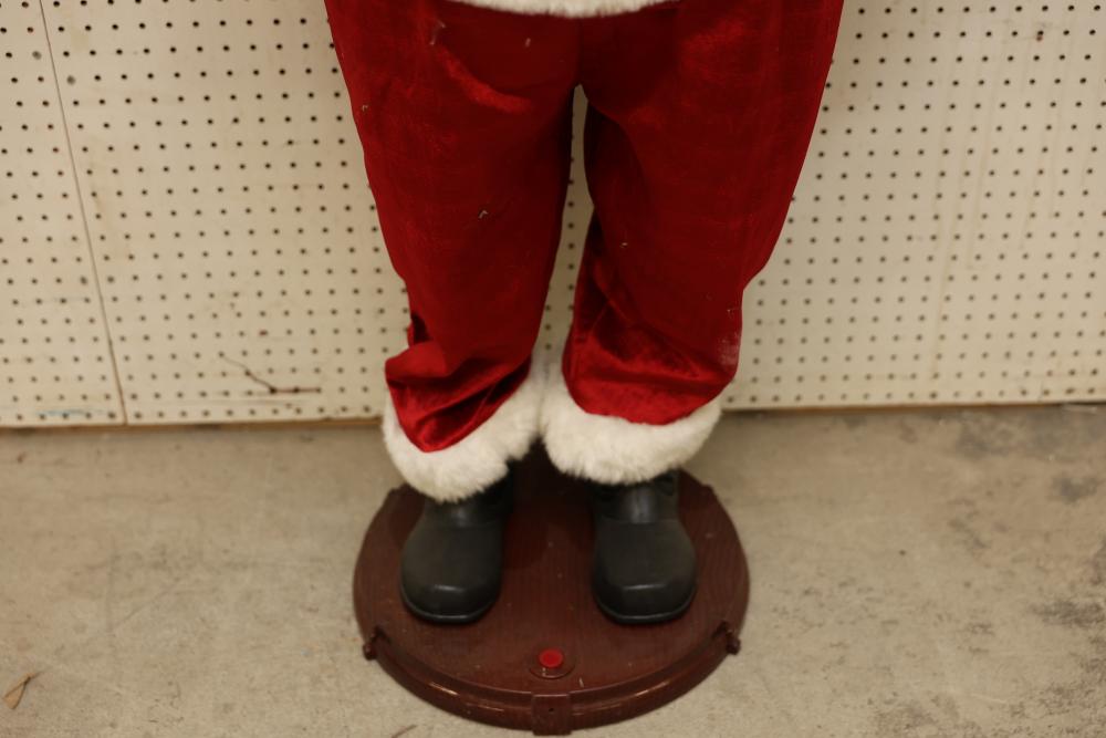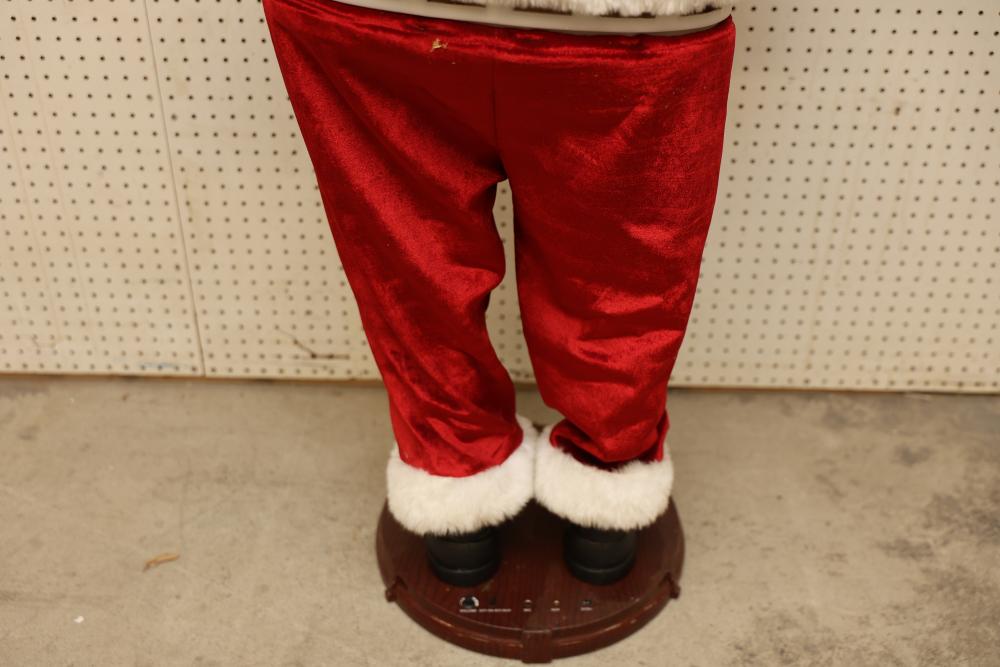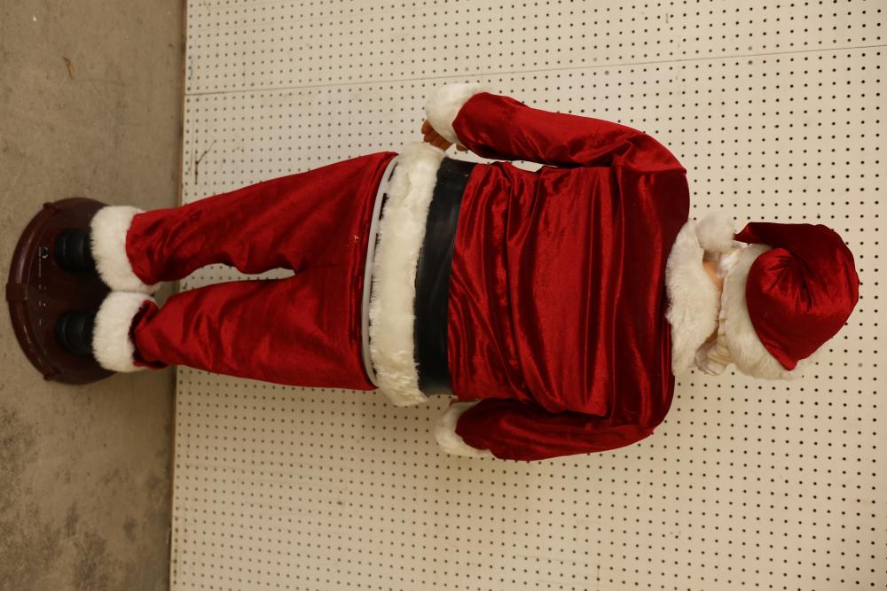 Life-Size Animated Santa Claus Figure With Sound and Motion. Features red velvet-style suit with white trim, black belt with buckle, and black boots. Includes volume knob, MIC input, AUX input, power switch, and DC 9V power input on the base. No power cable. Pickup only.