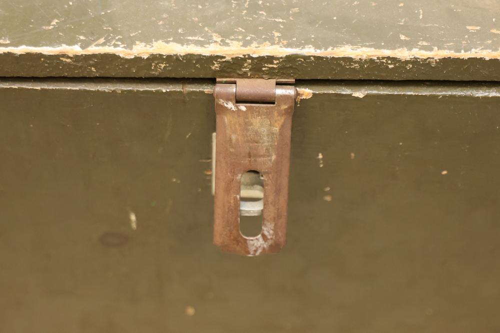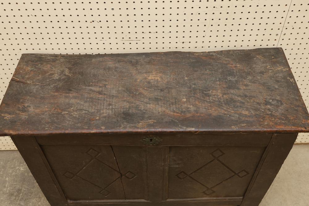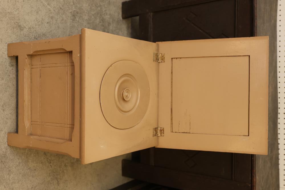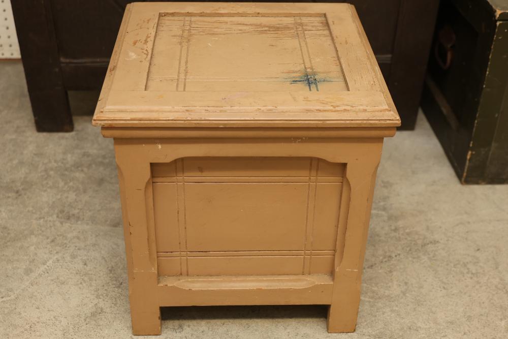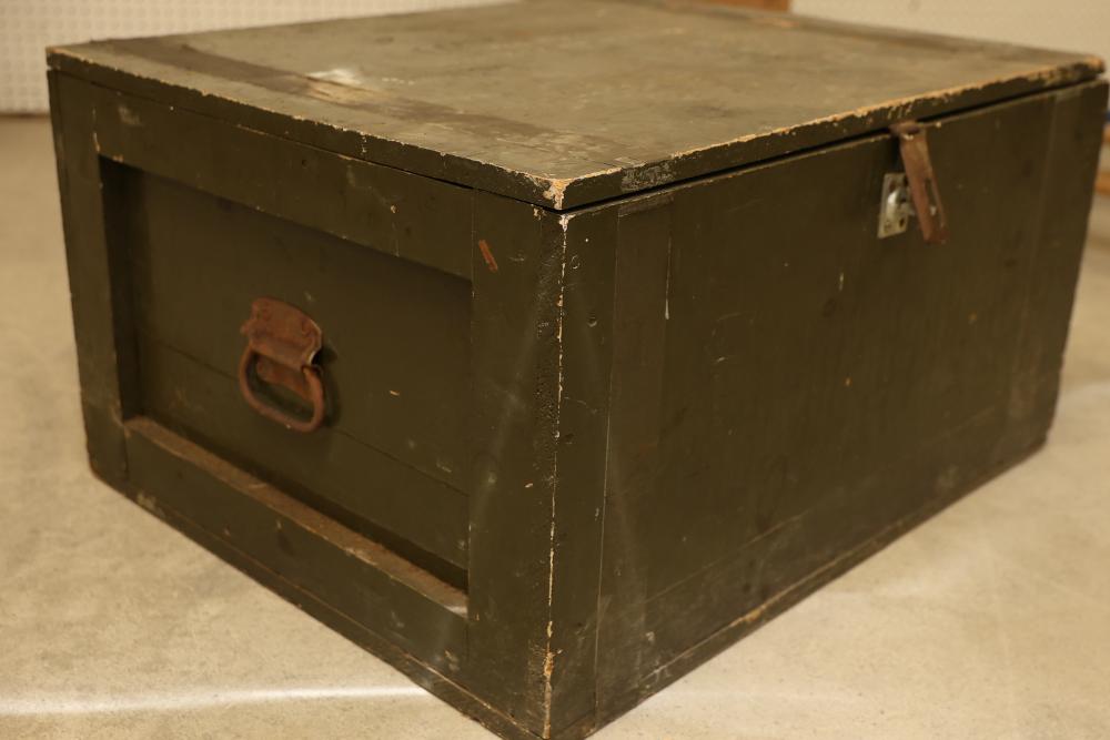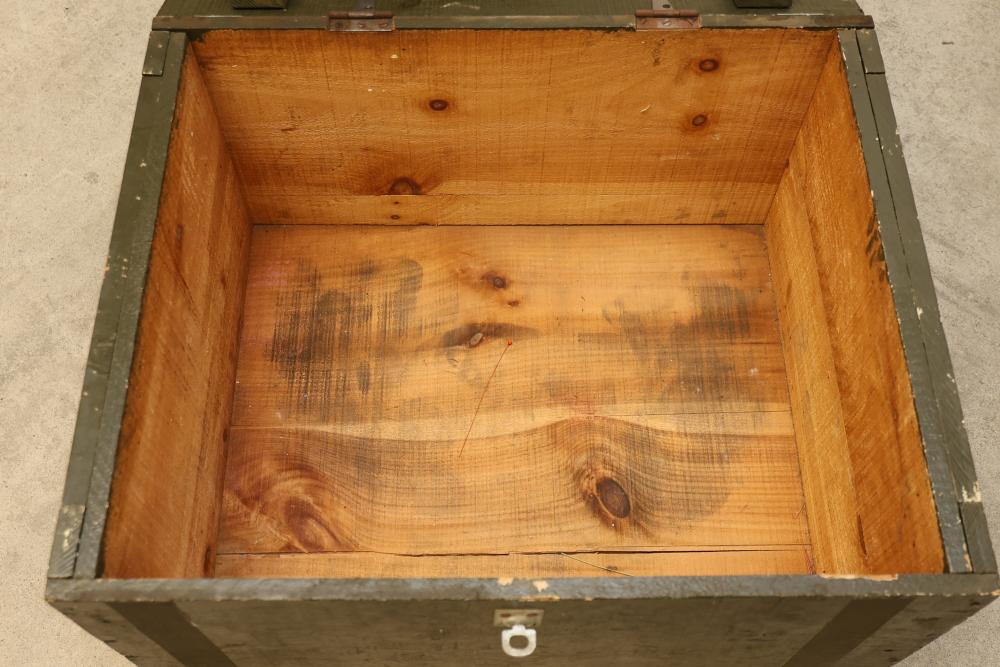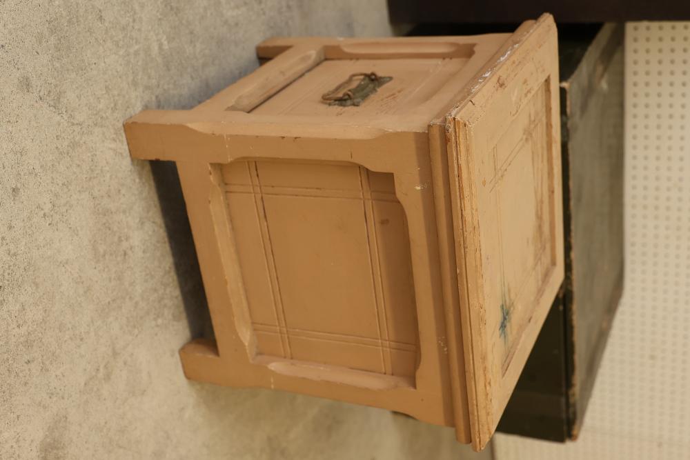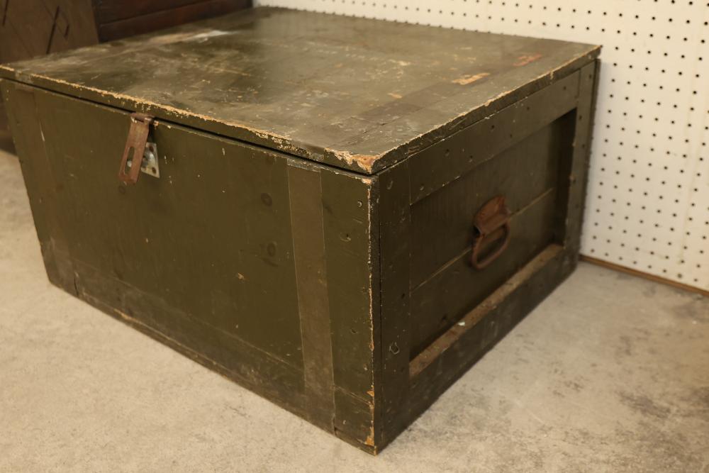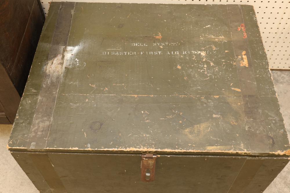 Wooden Chest, Green Trunk, and Painted Commode. The wooden chest features geometric carvings on the front and a hinged lid; largest item measuring 27-inch x 39.5-inch x 16-inch. The green trunk includes a metal clasp with -inchBell System Disaster First Aid Kit-inch markings. The painted commode has a removable inner section and a liftable top. Pickup only.