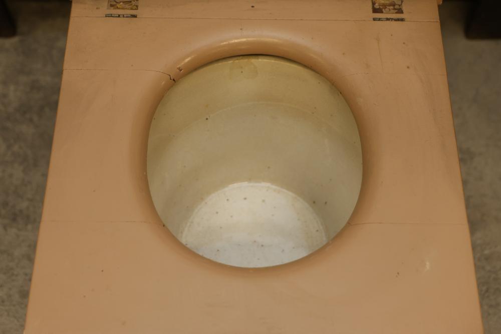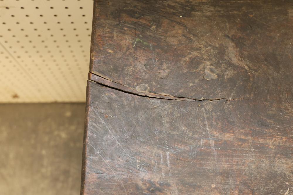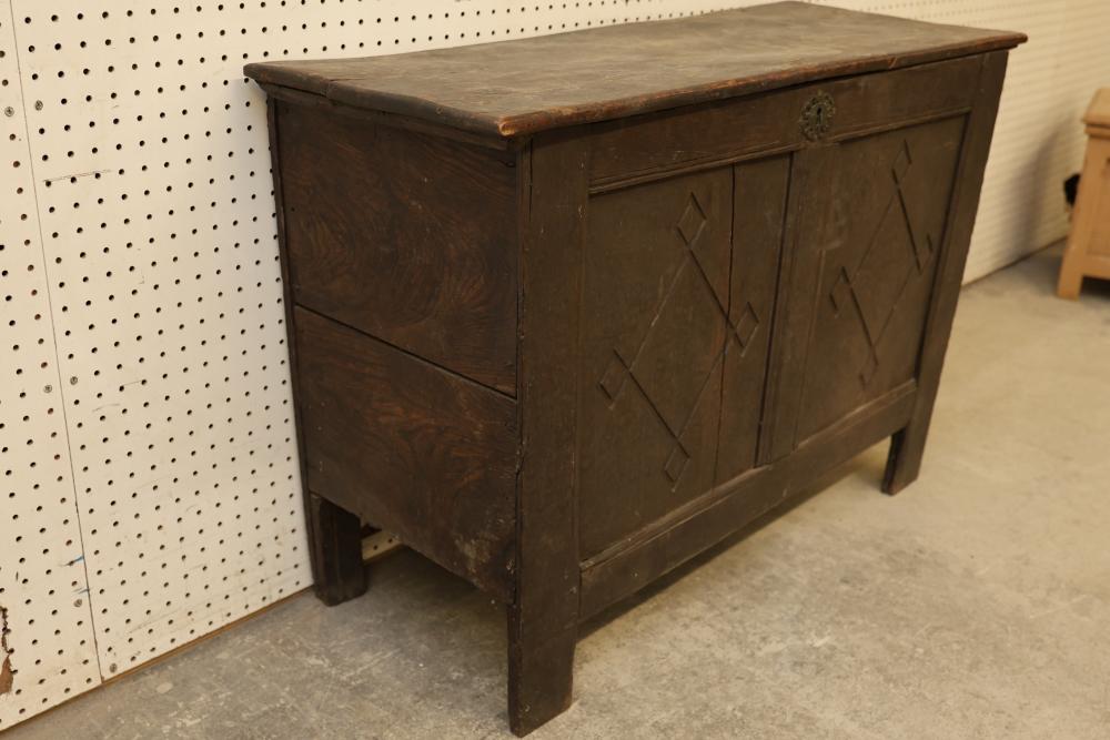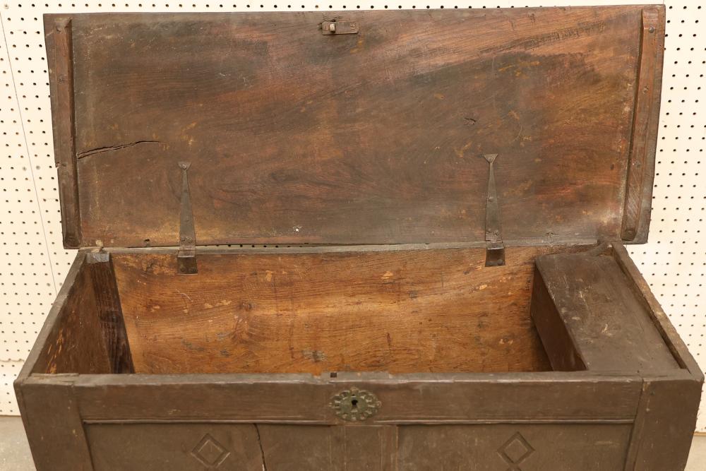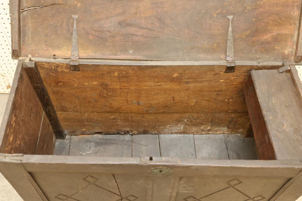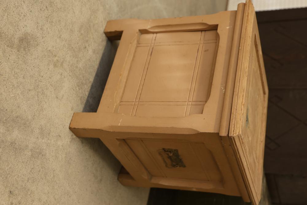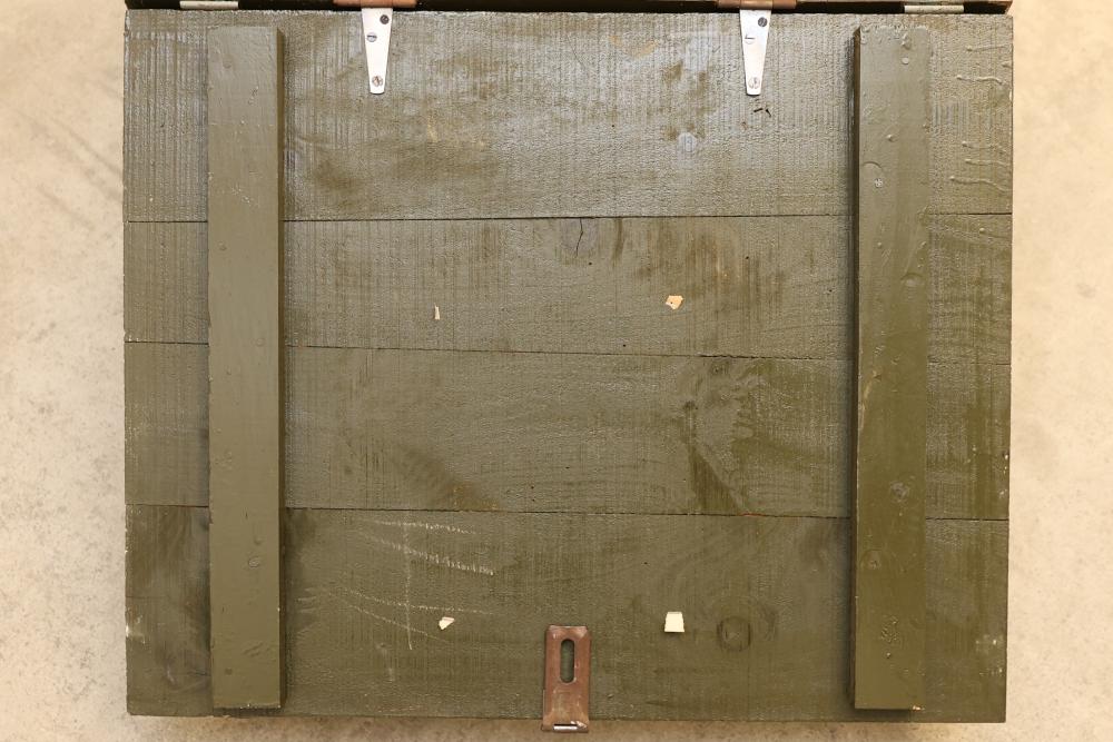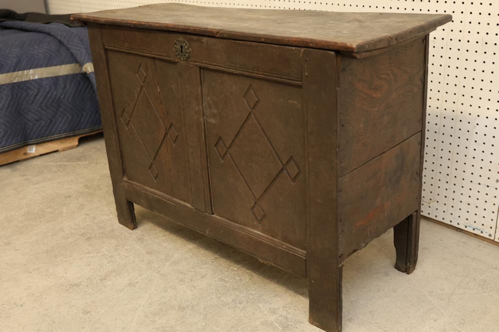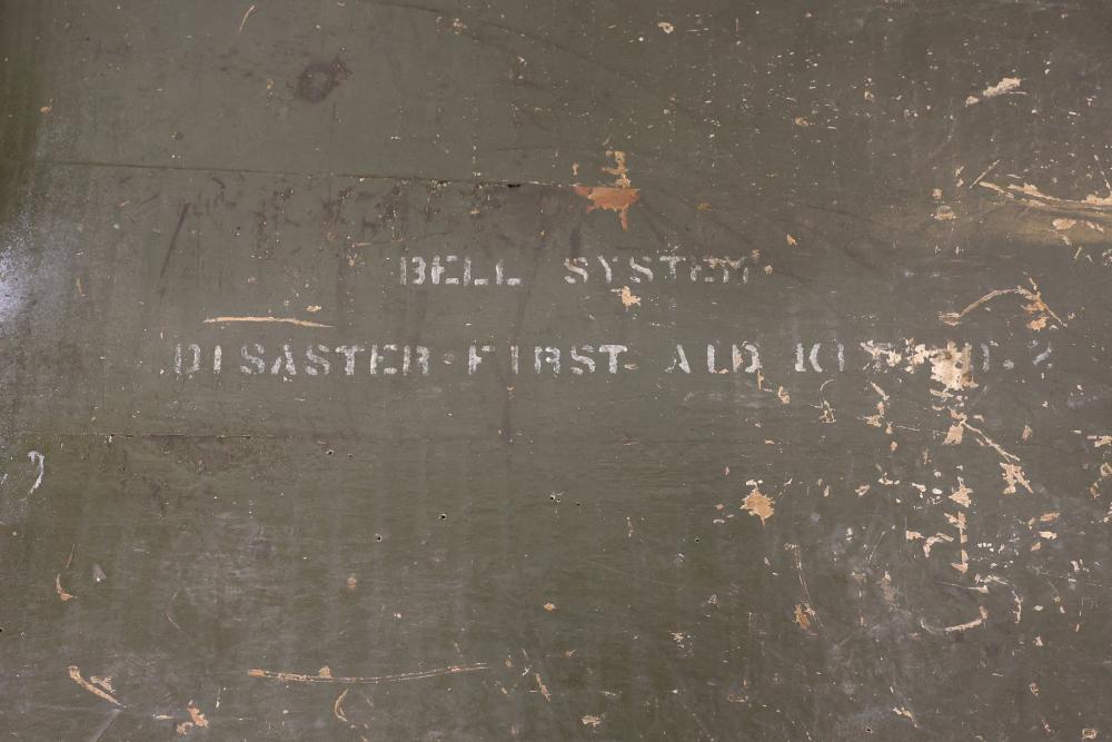 Wooden Chest, Green Trunk, and Painted Commode. The wooden chest features geometric carvings on the front and a hinged lid; largest item measuring 27-inch x 39.5-inch x 16-inch. The green trunk includes a metal clasp with -inchBell System Disaster First Aid Kit-inch markings. The painted commode has a removable inner section and a liftable top. Pickup only.