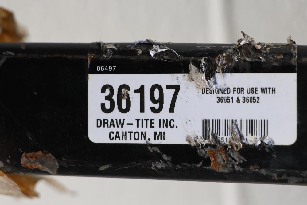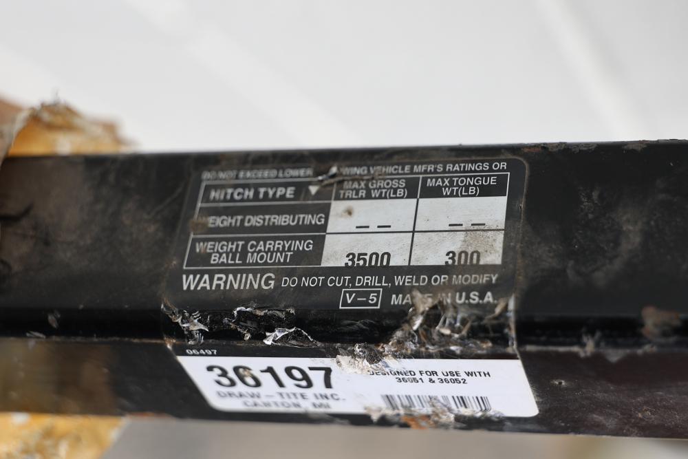 Draw-Tite Trailer Hitch 36197, 1.25 Inch Square Receiver Opening, 39.5 Inches in Length. Designed for use with models 36551 and 36052. Max gross trailer weight capacity is 3500 lbs, and max tongue weight capacity is 300 lbs. Warning label specifies that user should not cut, drill, weld, or modify. Designed for light-duty towing and hitch racks. Class 2 trailer hitch. Pickup only.