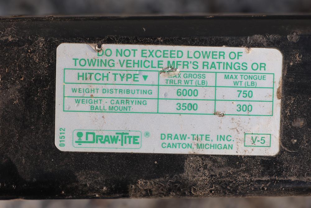 Draw-Tite V-5 Hitch with 2 Inch Square Receiver Opening, 48.5 Inches in Length. This hitch features a weight distributing trailer weight capacity of 6000 lbs with a max tongue weight of 750 lbs, and weight carrying ball mount capacity of 3500 lbs with a max tongue weight of 300 lbs. Pickup only.