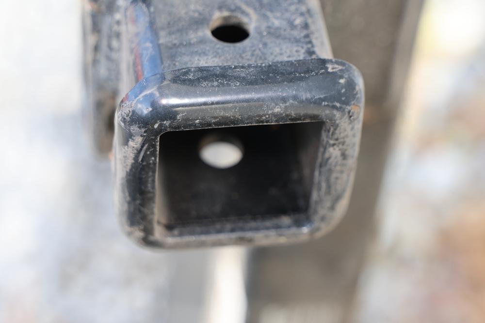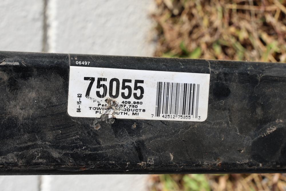 Trailer Hitch with 2 Inch Square Receiver Opening and 39.5 Inch Length. Includes specifications for weight capacity: 5,000 lbs max gross trailer weight and 500 lbs max tongue weight for weight-distributing setups, and 3,500 lbs max trailer weight and 350 lbs tongue weight for ball mount setups. Model number 75055, classified as V-5. Pickup only.