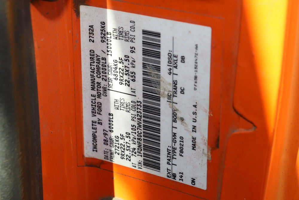 1998 Ford F800. VIN: 1FDNF80C7WVA23733. Odometer reading: 91041. Seller reports: Does not run/drive, ran when parked, cab rotted, frame rotted. Title & key available. Asset #: 1102A.