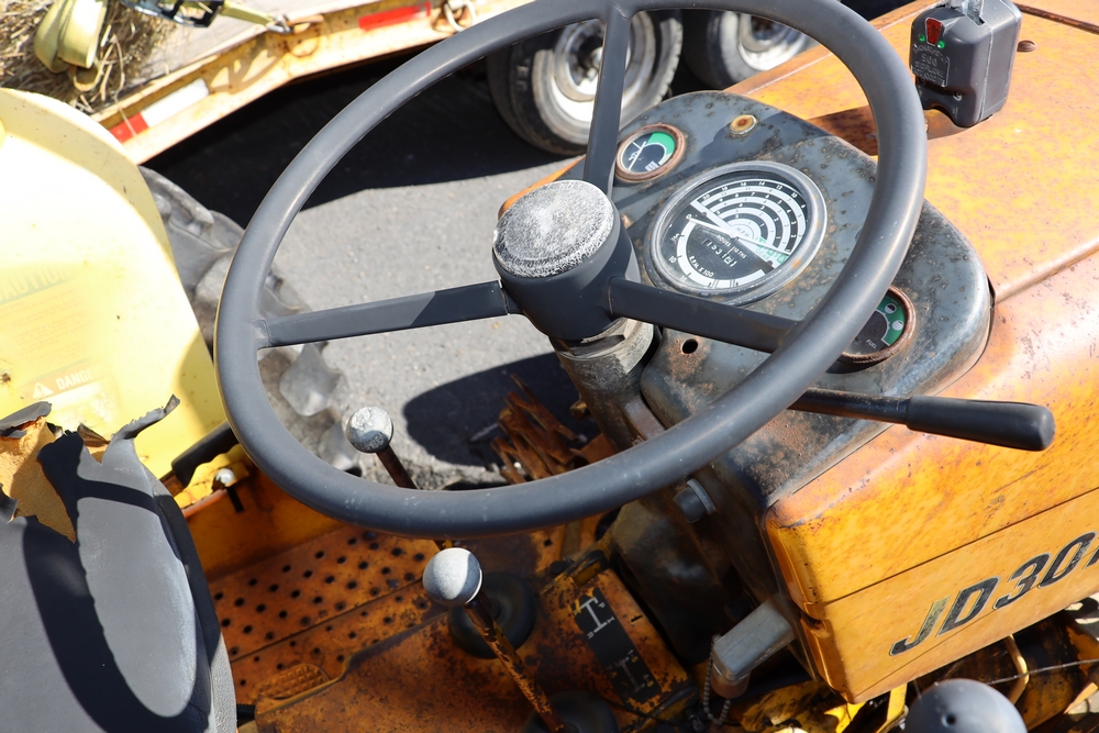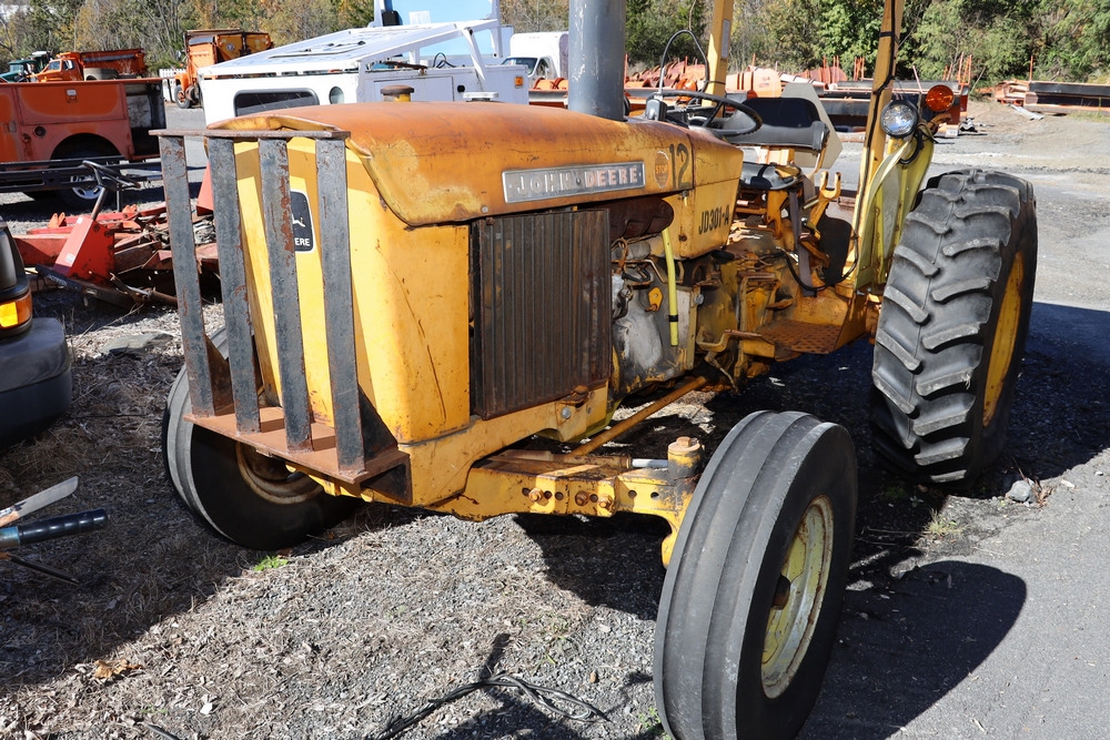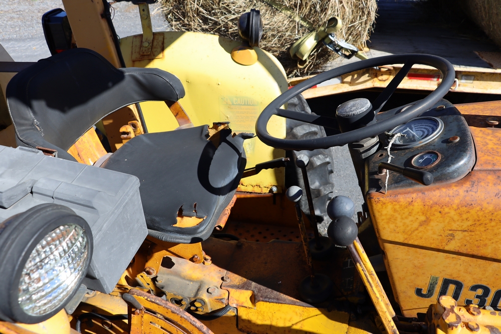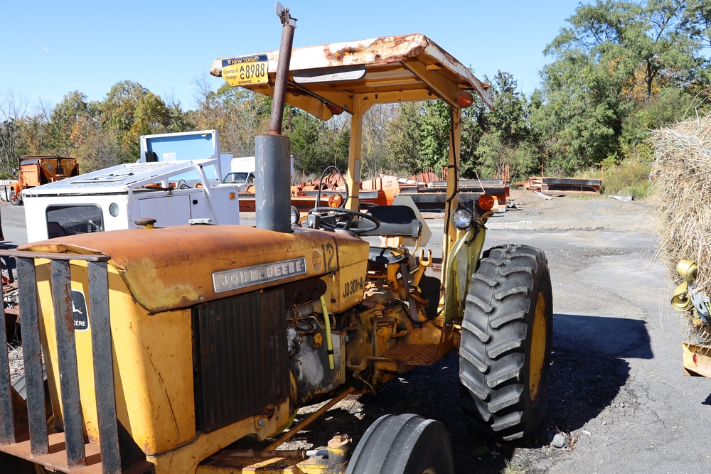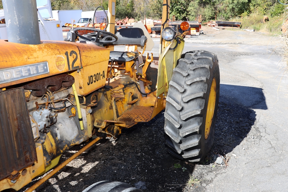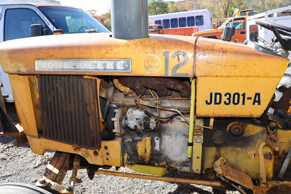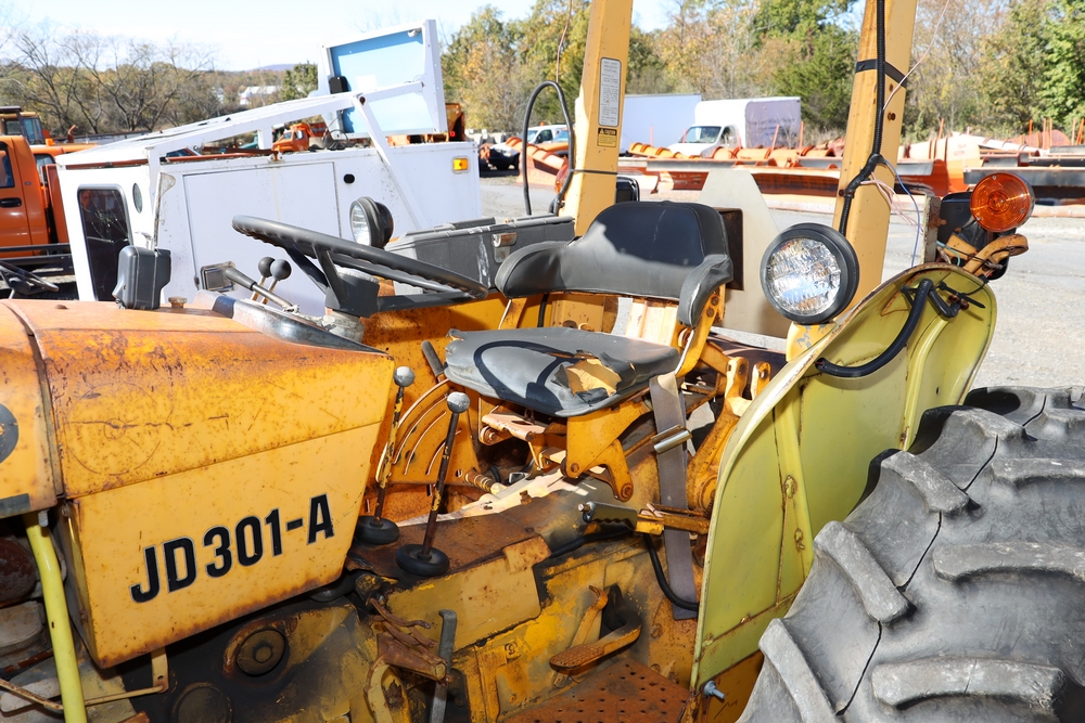 1980 John Deere JD301A. VIN: 301AD363300T. Hours reading: 2738hr. Seller reports: Does not run/drive, ran when parked, missing 3 pt hitch, Has working sickel bar, has rear pto. Title & key available. Asset #: 1312.