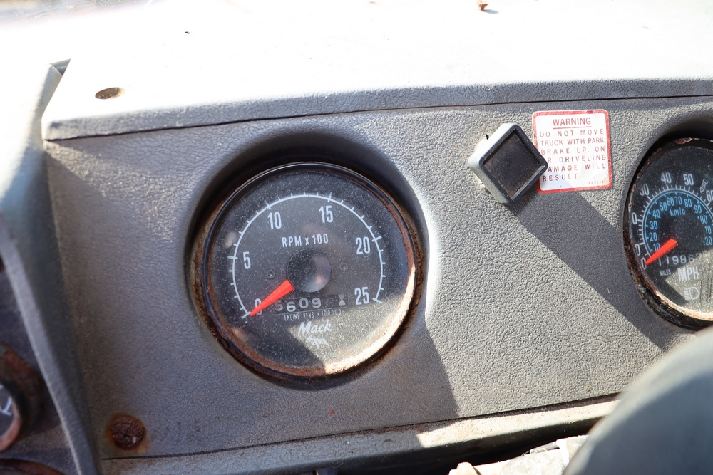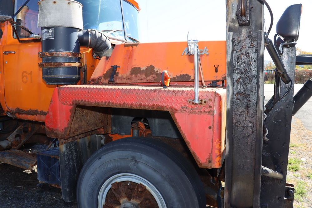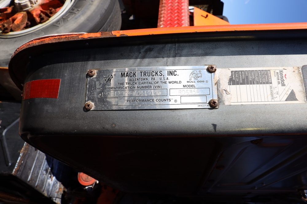 1987 Mack RD685P. VIN: 1M2P129C3HA011919. Odometer reading: 119855. Seller reports: Does not run/drive, ran when parked, cab rotted , frame rotted, cracked frame. Title & key available. Asset #: 1061A.