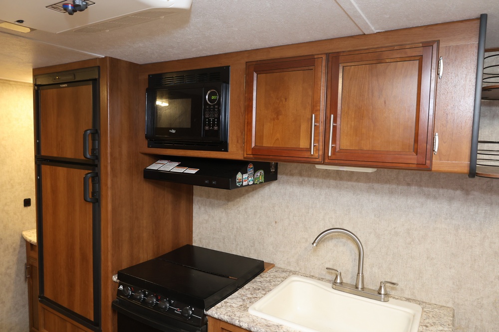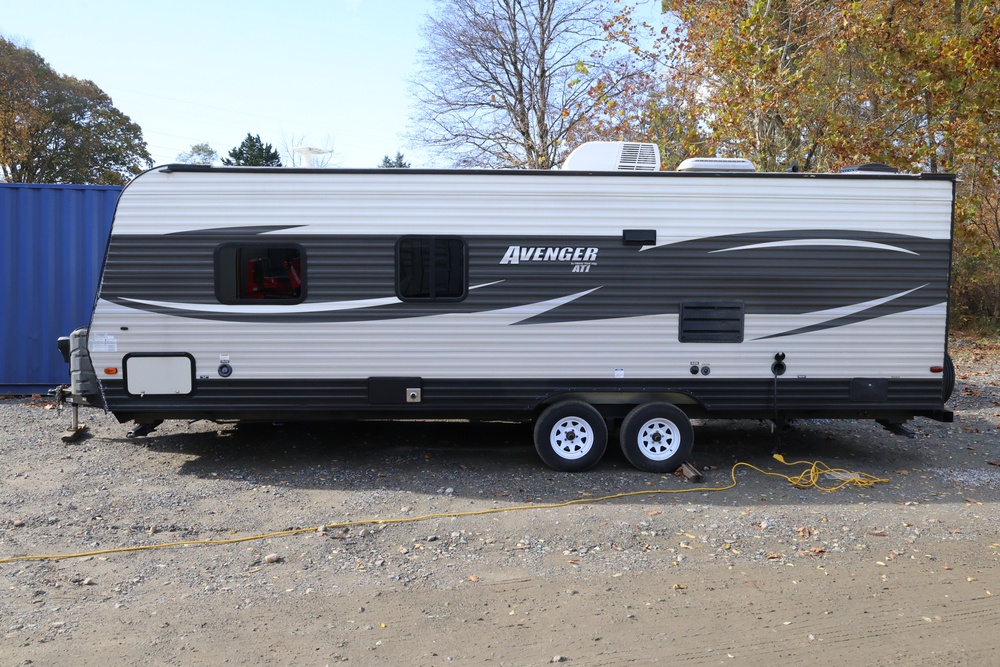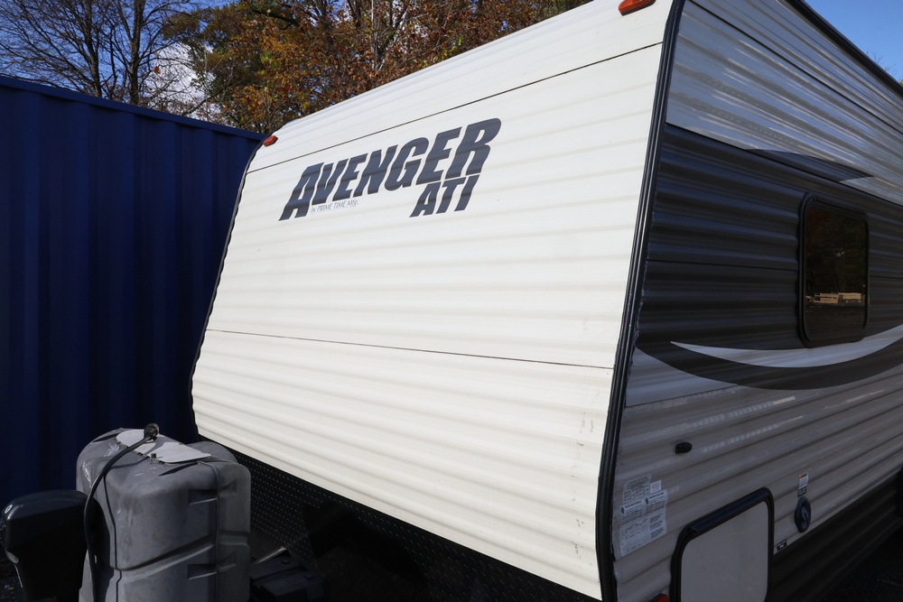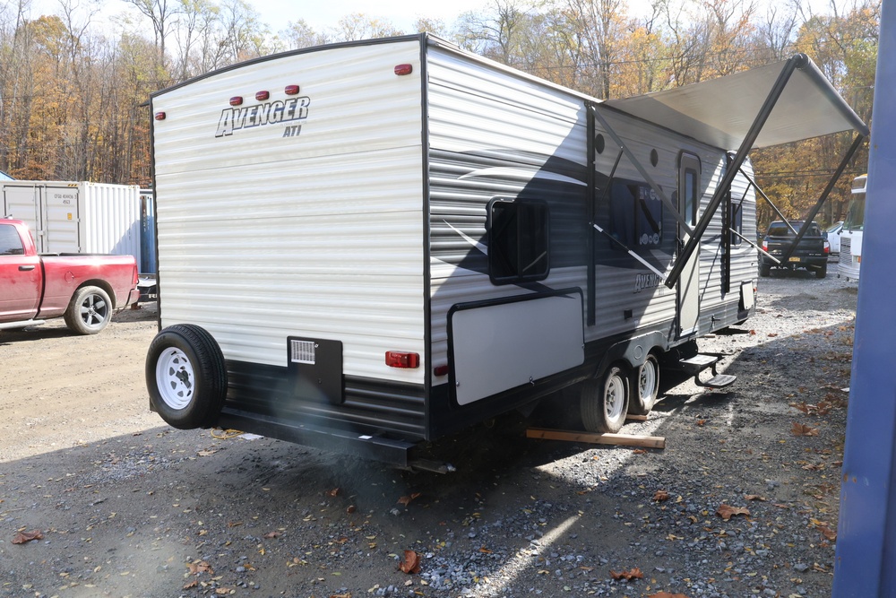 2018 Prime Time Avenger ATI 26BK travel trailer VIN: 5ZT2AVRB0JB917502 with a dry weight of 4,708 lbs and a GVWR of 7,474 lbs, offering a cargo capacity of 2,766 lbs. It features a front queen bed, rear bunk, a central kitchen and living area, and a full rear bathroom. The trailer includes an outdoor kitchen with a sink, mini fridge, and storage, as well as a spare tire and ST205/75R14C tires on 14x5.5 rims. It has a 2-5/16" coupler, a fresh water tank capacity of 158 kg, and a waste water tank capacity of 256 kg. The unit was manufactured by Forest River, Inc. on June 29, 2017. See photos of water leak in the front room. Title available. Title will transfer via dealer paperwork in Highland NY.