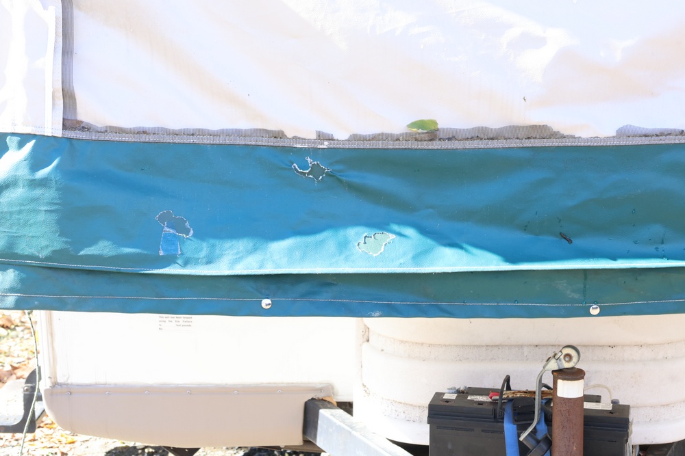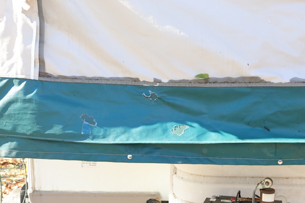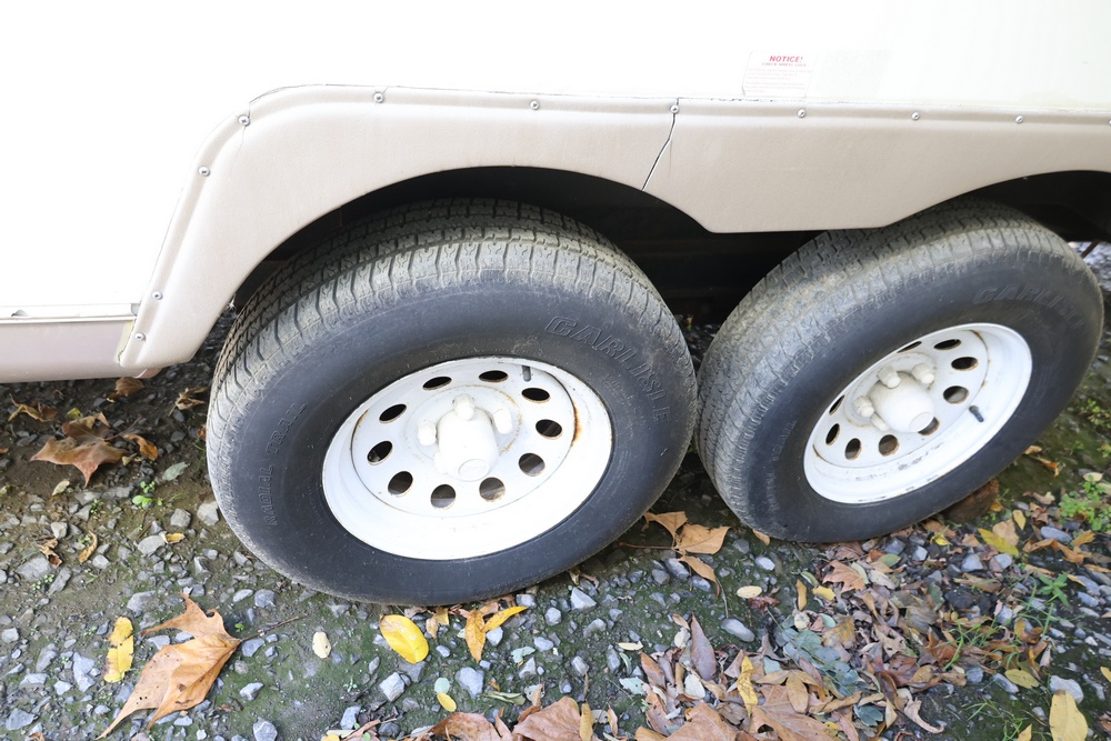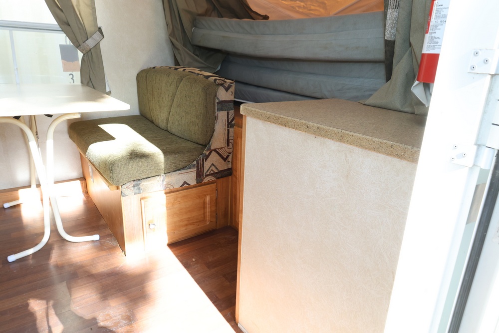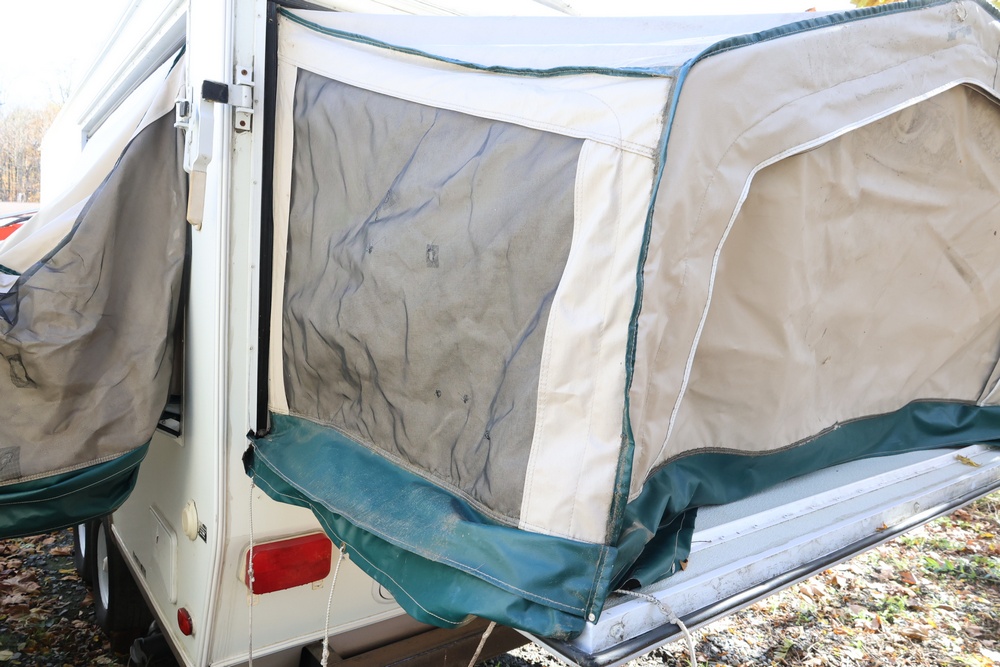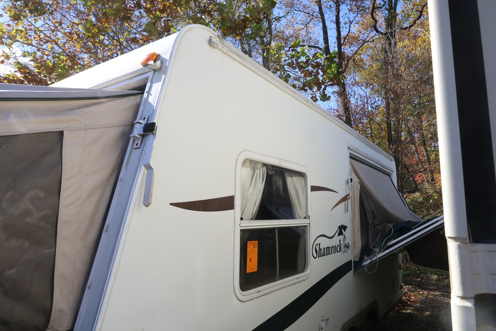 2007 Forest River Shamrock pop-out travel trailer VIN: 4X4TFLT267D095820. With a hybrid expandable design that includes canvas-covered pop-out sleeping areas on both ends and one side. The trailer features dual axles with white steel wheels, exterior graphics, a side awning, a three-burner gas stove, a dual basin kitchen sink, an overhead air conditioning unit, wood-paneled cabinetry, a dinette with upholstered seating, and a built-in Domestic refrigerator with matching wood paneling. Floor soft in areas. Title available Title will transfer via dealer paperwork in Highland NY.