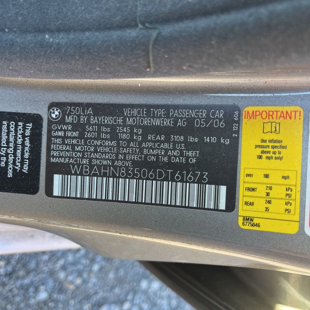 2006 BMW 750LI with a 4.8L V8 DOHC 32V engine. VIN: WBAHN83506DT61673. Odometer reading: 148,722 Miles. Seller reports: Runs and Drives. These vehicles are being transferred through NJ Dealer paperwork.