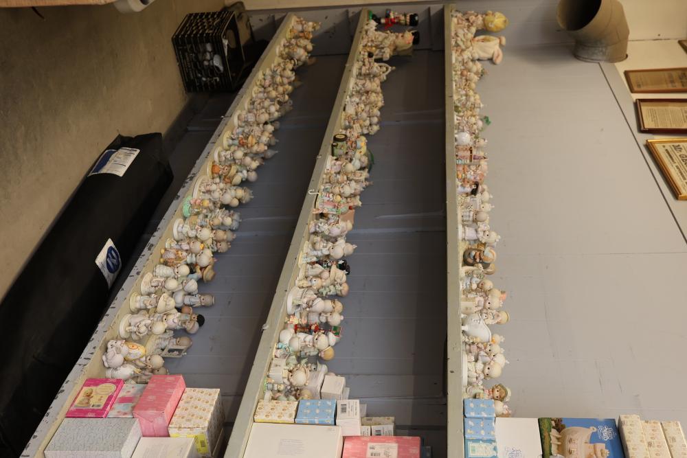 Approximately 200 Precious Moments figurines, many with original boxes. Includes a variety of designs, such as children engaged in activities, posed with animals, and themed holiday pieces. Some figures include accessories like musical instruments, decorative elements, or additional small figurines. Pickup only.