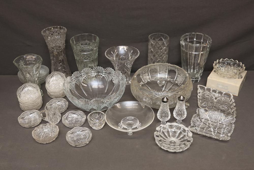Crystal Bowls, Dishes, Vases, and Tableware Pieces. This set features a wide range of clear crystal tableware items including bowls, dishes, vases, and salt and pepper shakers. Some pieces are marked. The collection showcases detailed patterns and various designs throughout the assortment. Pickup only. Buyer must bring packing materials.