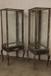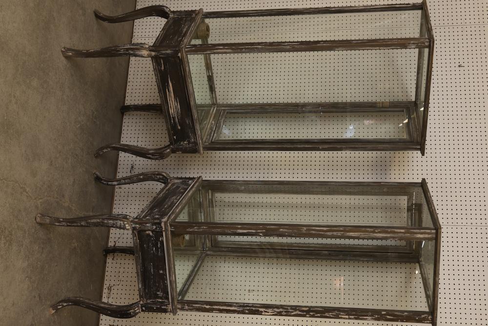 Two Weathered Display Cabinets with Glass Panels. Each cabinet features a wood frame with distressed finish, glass panels on all sides, and curved legs. The flat top and see-through design provide ample display space. No key available but doors are unlocked. Some hardware is included. 26inWx19inDx72.5inH, interior is 46inH Pickup only.