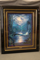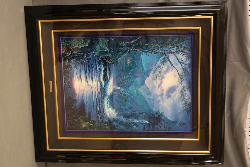 Christian R. Lassen Signed and Numbered Framed Artwork. This captivating piece displays a serene, detailed depiction of a tropical scene, combining lush landscapes, cascading waterfalls, and elements of the ocean under illuminated lighting. The piece is signed and numbered by Christian R. Lassen, as seen near the bottom edge, marking its authenticity. It is professionally framed with a double mat design and features a plaque with the artist's name. Pickup only.