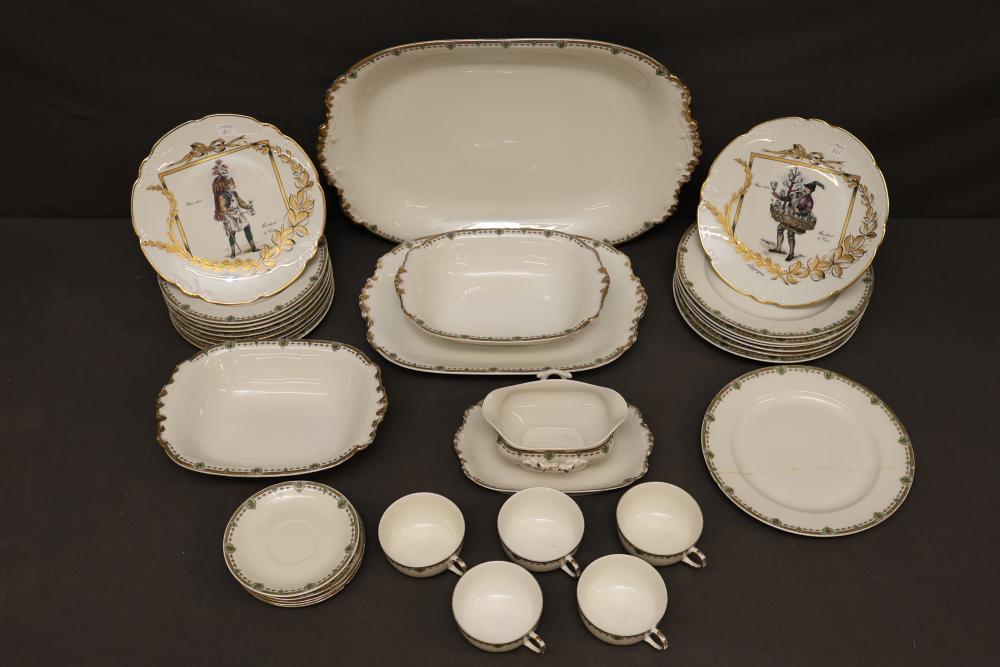 Limoges Porcelain Dinnerware Set Featuring Limoges Plates and Serving Pieces. This porcelain dinnerware features a variety of elegantly designed pieces, including multiple plates, bowls, serving dishes, and cups. Of particular note are the plates marked Limoges, featuring detailed illustrations and gold accents. Additional pieces feature decorative patterns to complement the set. Pickup only.