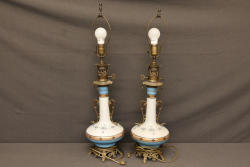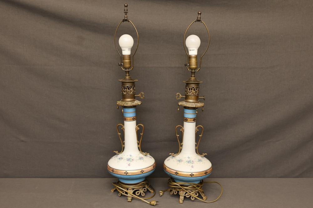 Electric table lamps featuring floral porcelain bases accented with brass details and a wired design. Each lamp includes an ornate brass base with scrollwork, a floral-patterned porcelain lower body, and a brass framework transitioning to the bulb holder. Pickup only.