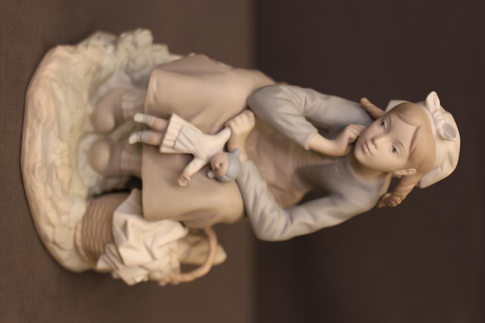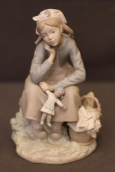 Lladro Porcelain Girl with Doll and Basket Figurine. Features a seated girl in a pale blue and beige outfit with a headscarf, holding a doll while a wicker basket with folded linens rests beside her. Marked on the underside with the Lladro logo. Pickup only.