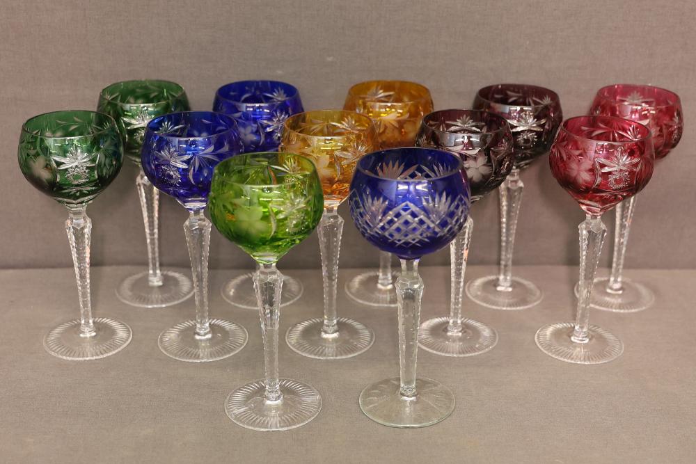 12 Multi-Colored Cut Crystal Wine Glasses. This set includes wine glasses in an assortment of vibrant colors such as green, blue, yellow, purple, and red. Each glass features intricate cut designs and rests on a clear stem. Pickup only.