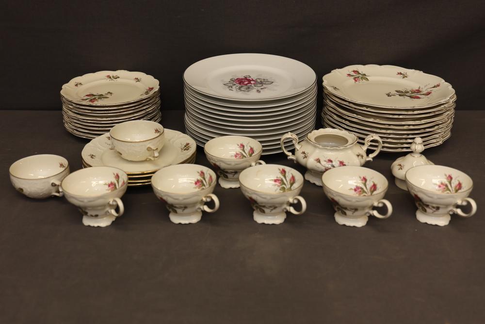 Rosenthal Pompadour China Dinnerware Set with Floral Design. Set includes dinner plates, dessert plates, teacups with saucers, a creamer, sugar bowl with lid, and other coordinated pieces. Each item features floral patterns accented with gold trim. All pieces display the Rosenthal mark on the underside. Pickup only.