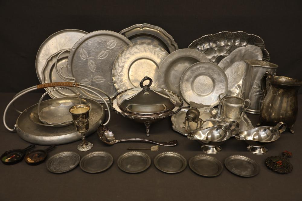Decorative Metalware Including Rogers Silver and Farberware. This includes trays, pitchers, plates, serving bowls, and various decorative miniatures. The pieces showcase a mix of engraved and embossed details with various maker's marks, including Rogers Silver, Farberware, and additional stamped pieces. Sold as photographed. Pickup only.