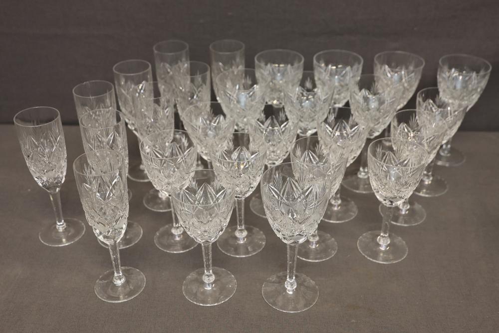Crystal glass stemware including wine and champagne glasses. Features a matching design with intricate cuts. Includes a variety of sizes and styles suited for different types of beverages. Pickup only.