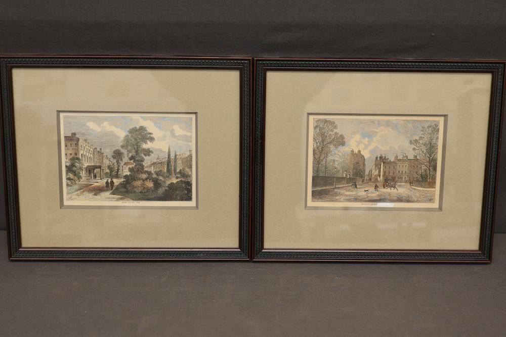Framed Architectural Engravings Depicting Queen Square and Berkeley Square. Two detailed engravings dated 1810, both signed with an identifiable monogram. Each piece is double-matted and framed with identical decorative wooden frames, and both include hanging wires. Pickup only.