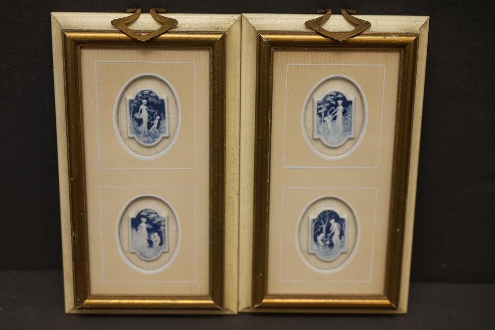 Two framed sets of blue and white relief plaques featuring figures in classical-style scenes. Each frame includes two individually matted oval plaques with detailed designs. Frames are gold-toned and include hanging hardware. Some wear is visible on the frame backs. Pickup only.