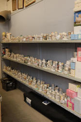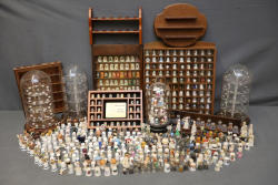 Extensive collection of decorative thimbles including ceramic, porcelain, and themed designs. Wide variety of intricate styles and motifs, with multiple custom display cases, shelves, and two glass dome display stands. Features notable collections such as Hummel-designed thimbles, animal-themed designs, and novelty figurines. Includes wood-framed wall-mounted cases and display racks. Pickup only.