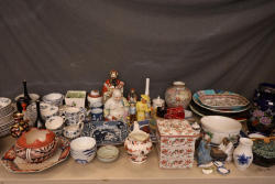 Ceramic and Porcelain Items Featuring Decorative Bowls and Figurines. This assortment includes various decorative items, including figurines, bowls, plates, and vases adorned with intricate patterns and hand-painted details. The items showcase a range of styles and motifs, offering an eclectic aesthetic for display or utility. Pickup only.